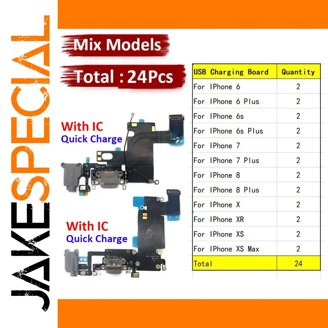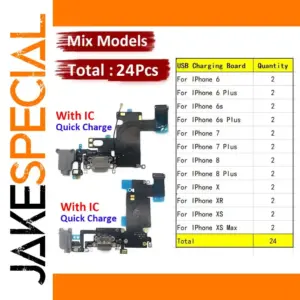 - Set of 24 high-quality flex cables compatible with iPhone 6, 6S, 7, 8 Plus, X, XR, XS, and XS Max models, designed for reliable charging port replacements.