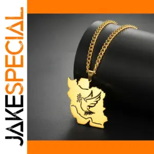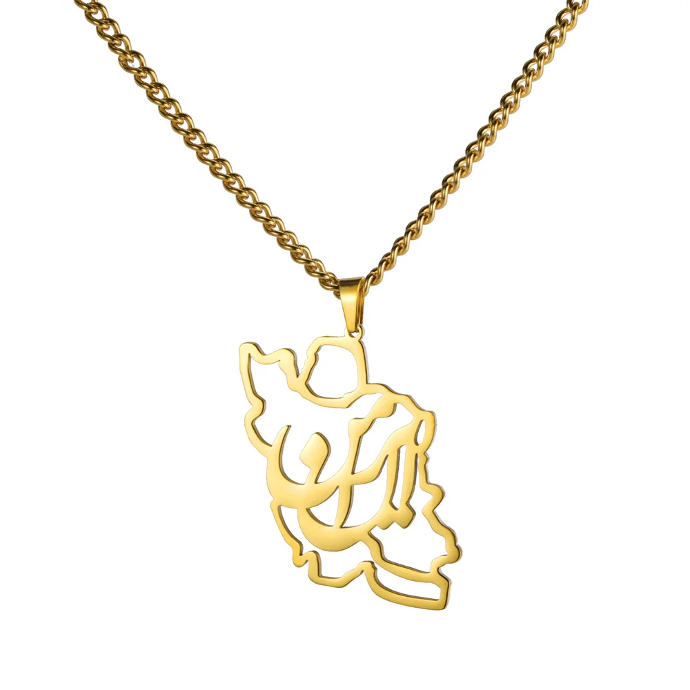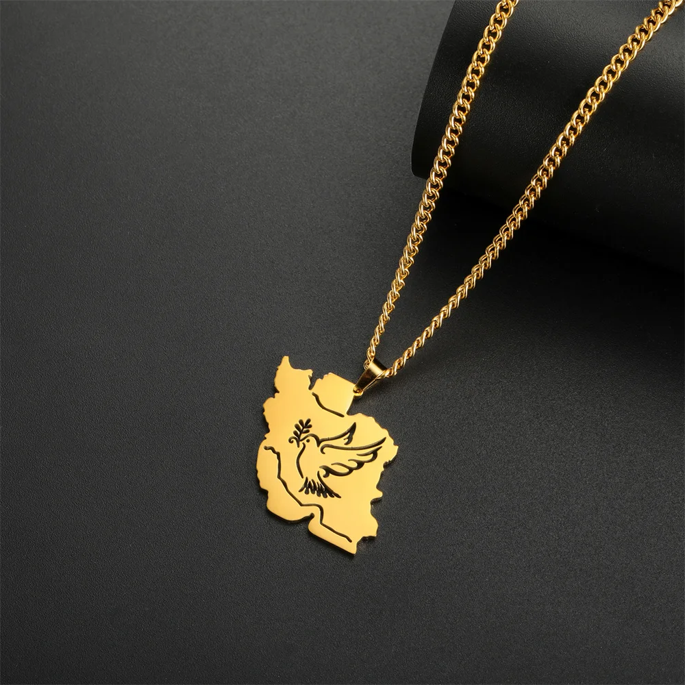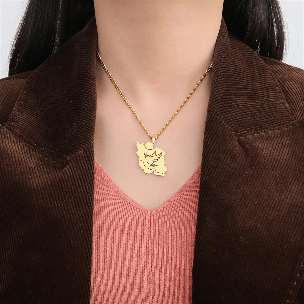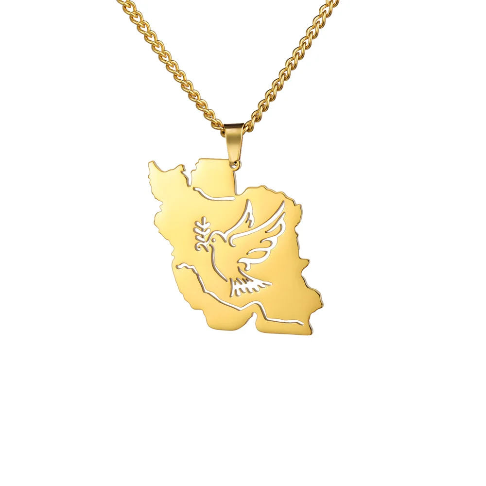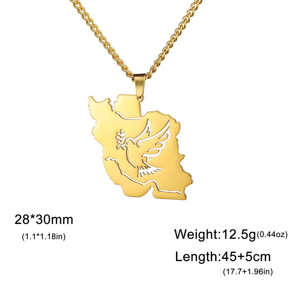 Imagine yourself wearing this beautifully crafted necklace that symbolizes unity and peace. Made of high-quality stainless steel, it features a smooth, polished gold-tone or silver-tone pendant that depicts the outline of Iran, measuring approximately 28 by 30 millimeters. The pendant is detailed with an engraved stylized peace dove, wings outstretched, holding an olive branch in its beak—an enduring symbol of harmony. The sturdy link chain, available in lengths from 45 to 50 centimeters, complements the pendant's minimalist and elegant design. Perfect for any occasion, this unisex necklace combines timeless style with meaningful symbolism, making it a versatile addition to your jewelry collection or a thoughtful gift for loved ones who cherish peace and cultural pride.