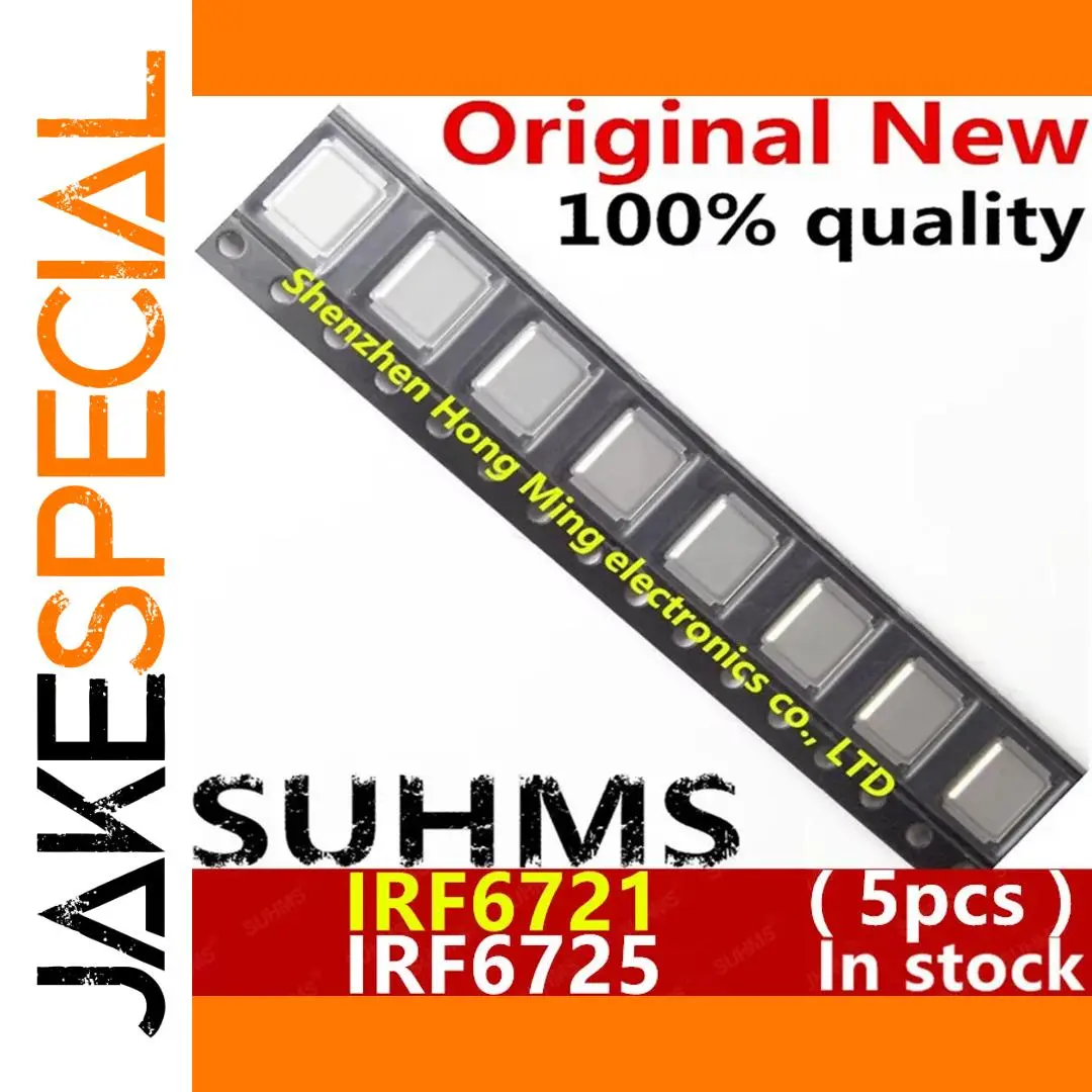 Experience reliable performance with this set of five brand-new surface-mount drive ICs, including models IRF6721 and IRF6725. These sleek black plastic components feature a glossy finish, complemented by silver-colored metal contacts, offering a modern and professional look. Each IC is precisely arranged on a transparent carrier tape, making handling and installation straightforward. Designed for electronic and computer applications, these chips deliver consistent, efficient power management. Their compact SMD packaging allows for seamless integration into circuit boards, ensuring optimal space-saving functionality. With standard operating temperatures and compatibility with international voltage levels, these ICs are built for durability and precision. Perfect for professionals seeking dependable components in advanced electronic projects.