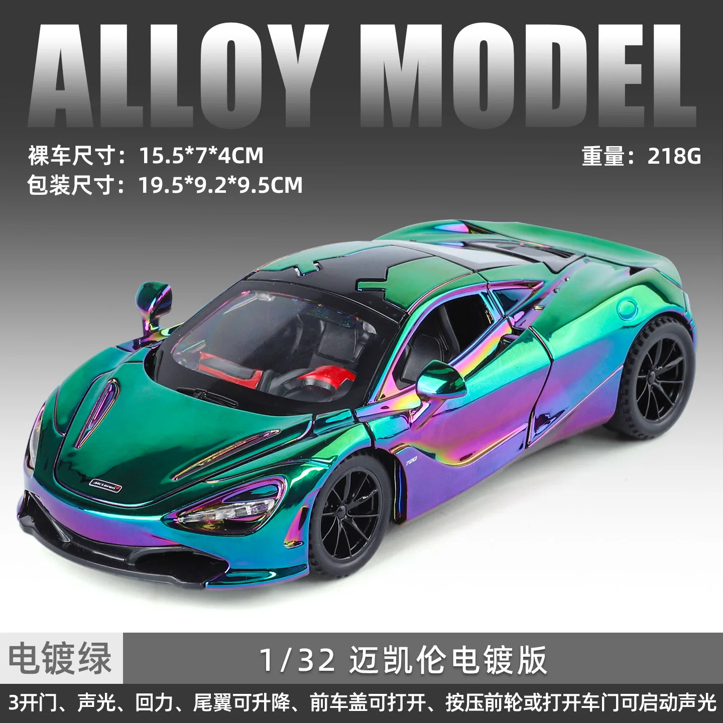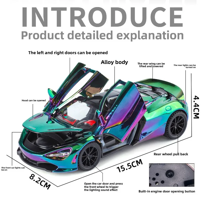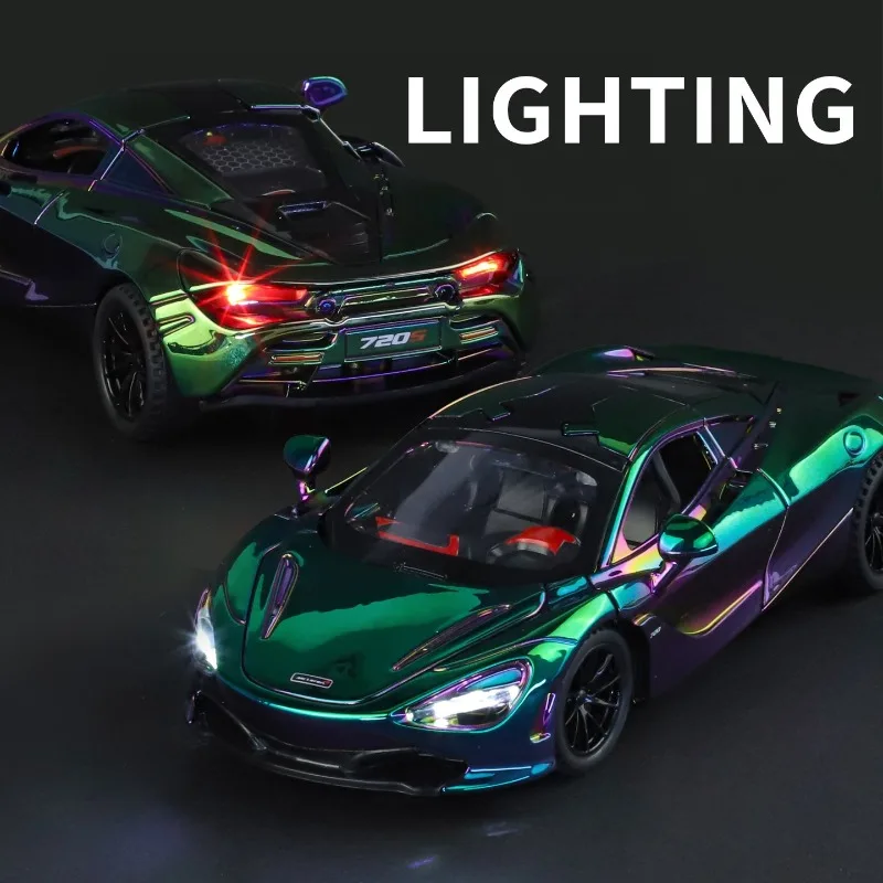 Imagine owning this stunning 1/32 scale diecast metal model of the iconic McLaren 720S Super Sport Car. Its mesmerizing rainbow-like finish shifts captivating colors like green, purple, blue, and pink as you move around it, creating a dynamic visual experience. The sleek exterior design features aerodynamic lines, a low profile, wide stance, and sharp details such as angular headlights and a sculpted hood that exude speed and sophistication. The glossy surface enhances the vibrant colors, while the black multi-spoke wheels with low-profile tires give it a bold, aggressive stance. Perfectly crafted for display or gifting, this model captures the high-performance essence of the real supercar while adding a luxurious touch to your collection.