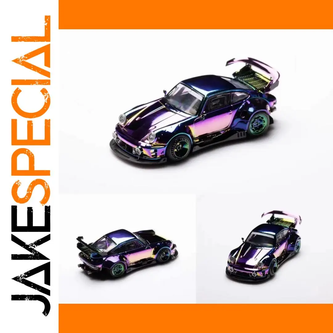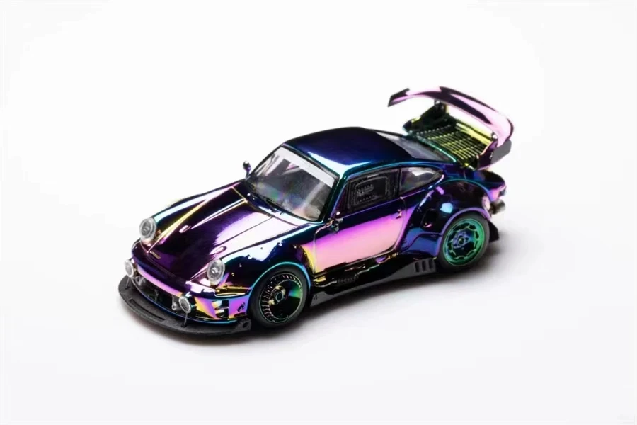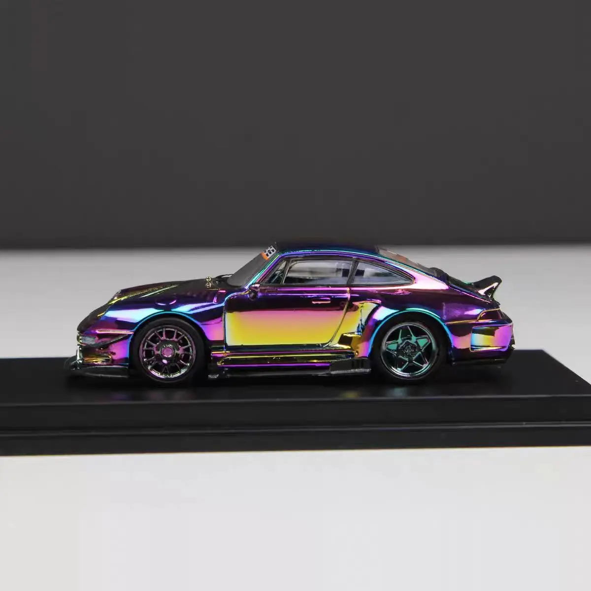 Experience the dynamic appeal of this 1:64 scale diecast model car, crafted from alloy with no electrical components or batteries. Featuring an iridescent, colorful plating finish that shifts between purple, pink, and blue, this model offers a captivating holographic effect. It showcases detailed sculpted fenders, sleek aerodynamics, a prominent rear wing spoiler in matching iridescent hues, and intricate engine bay craftsmanship. With multi-spoke black rims accented in green and low-profile tires, it embodies a sporty and futuristic aesthetic. Suitable for collectors aged 14 and above, this high-quality display piece combines vibrant color, detailed design, and superior craftsmanship to bring your collection to life.
