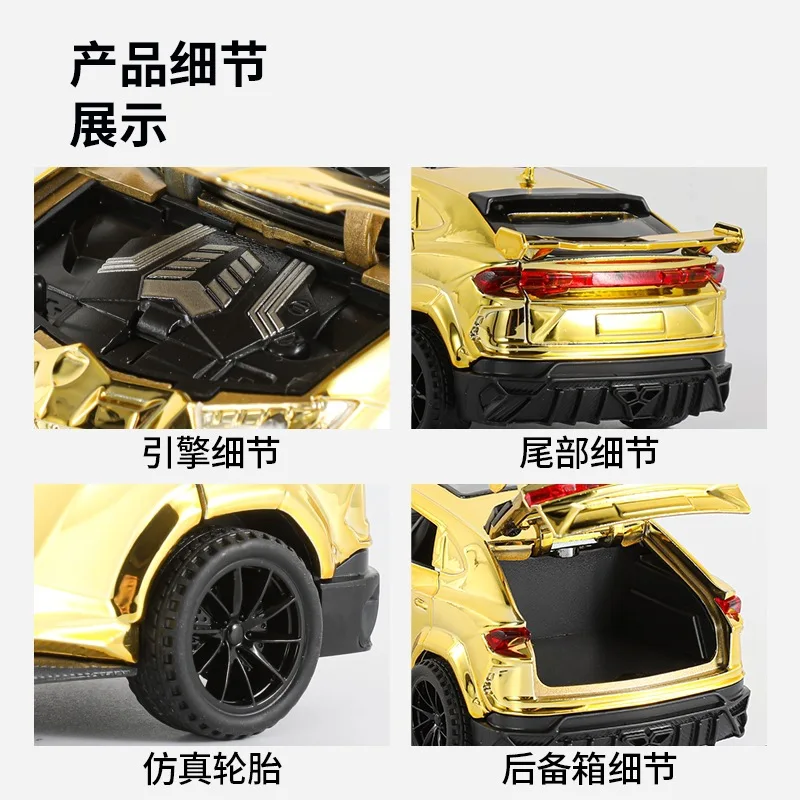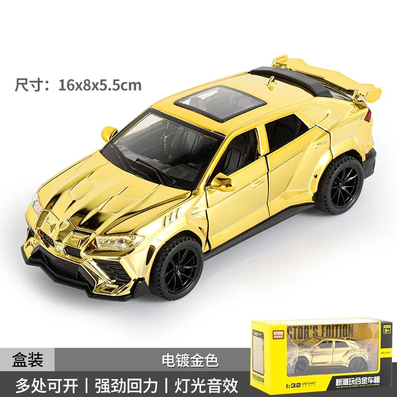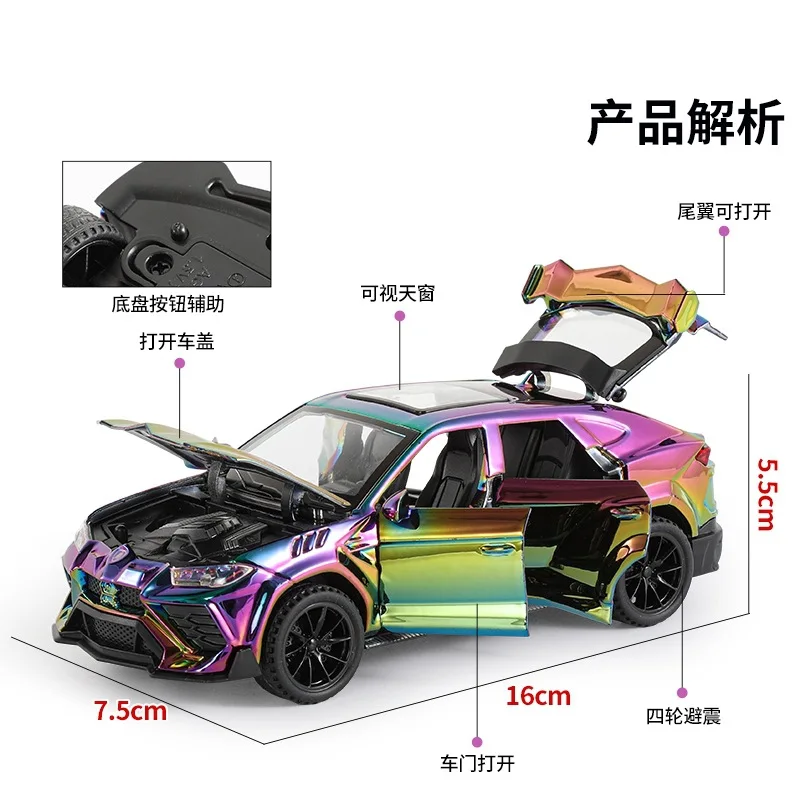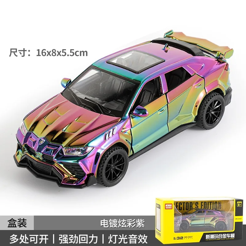 Experience the thrill of owning this visually striking 1:32 scale diecast Lamborghini Urus model. With its mesmerizing rainbow-like metallic finish that shifts shades from purple, green, gold, and pink depending on the light, it captures attention instantly. Designed with realistic details such as sharp angled headlights, an aggressive front grille, and a sculpted rear bumper, this model exudes sportiness. The panoramic glass roof and asymmetrical mirror accents add modern elegance, making it a perfect display or collectible item. The large rear wing spoiler, matching the iridescent finish, emphasizes performance and adds to its dynamic appeal. With multi-door operation and detailed wheels, this model combines aesthetic beauty with interactive functionality, creating a captivating visual experience for adult collectors and enthusiasts alike.