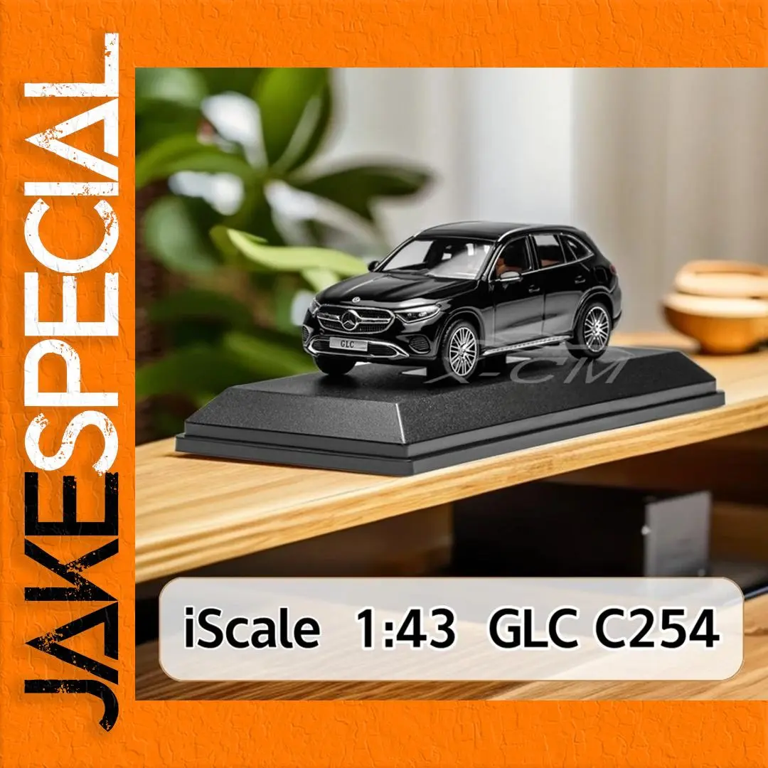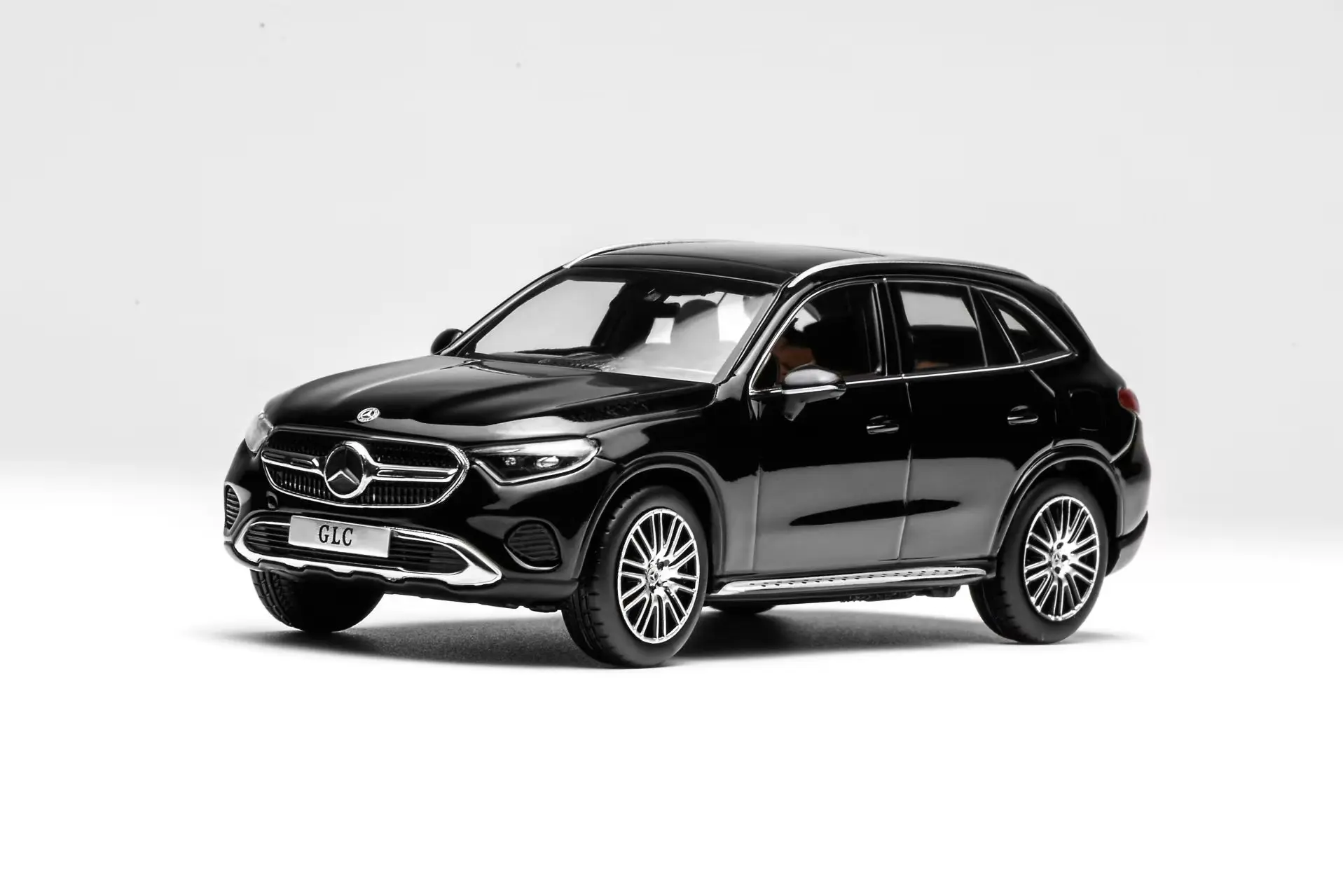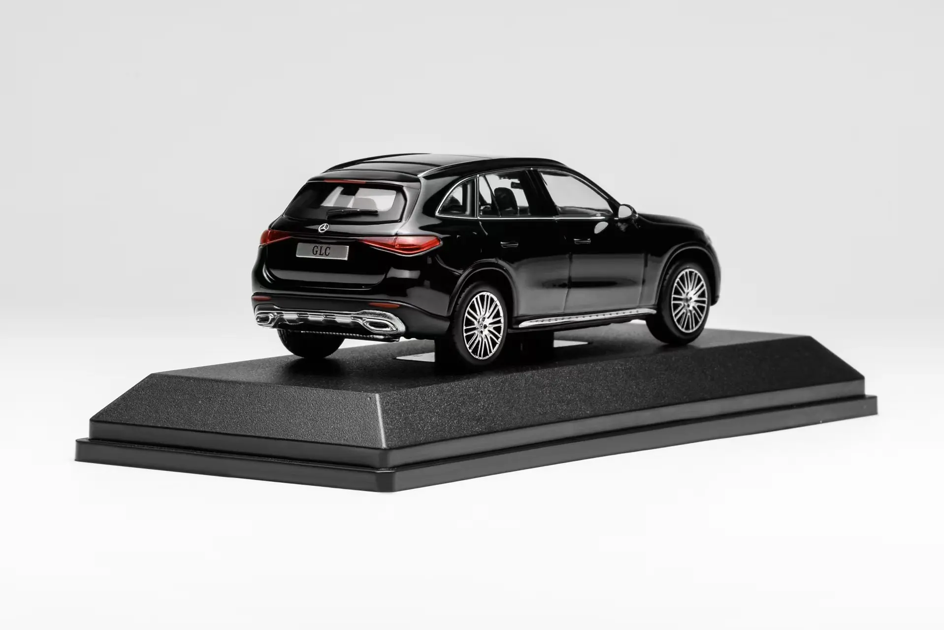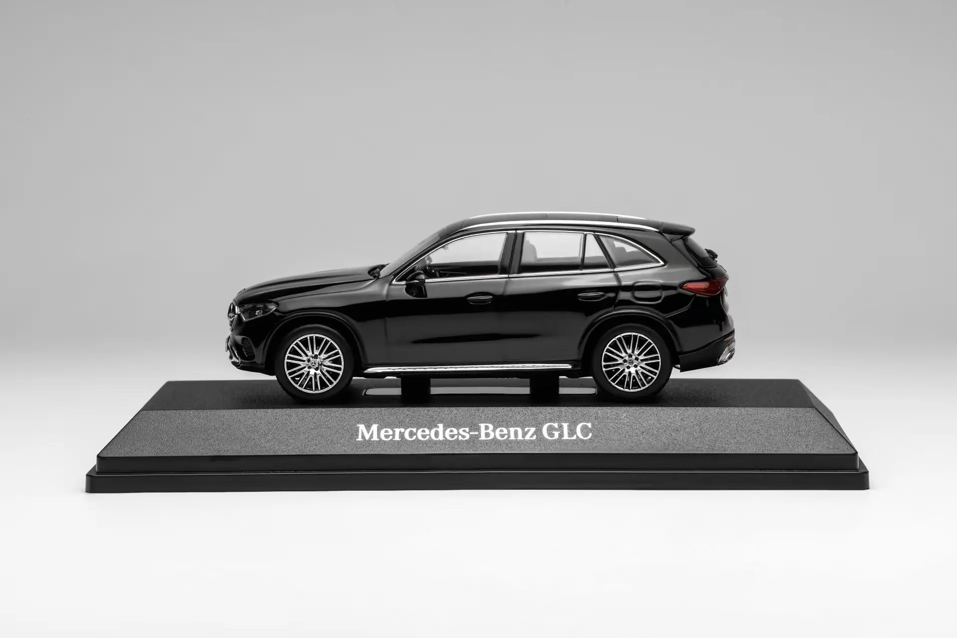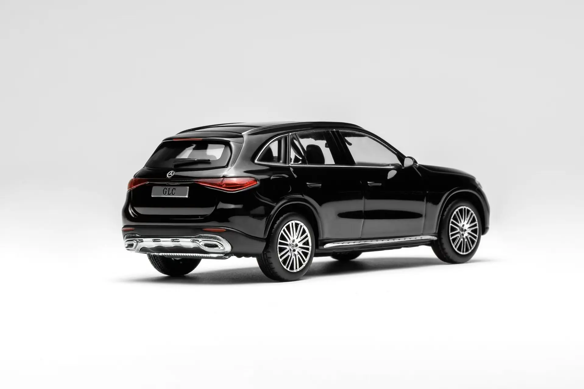 This 1/43 scale diecast model car represents the iScale GLC C254, showcasing a stunning black glossy finish that highlights its elegant design. Crafted from durable metal, it features intricately designed headlights, a distinct front grille with the emblem, and well-proportioned smooth lines that convey a modern aesthetic. The alloy-style wheels are positioned at a slight angle for enhanced visual appeal. Mounted on a rectangular black base with a textured surface, this model includes a subtle “GLC” label, making it a perfect collectible item for display. Ideal for collectors, this piece is not intended for play and is designed for individuals aged 18 and older.