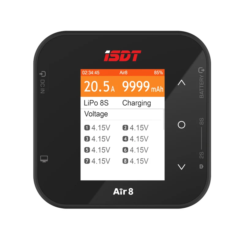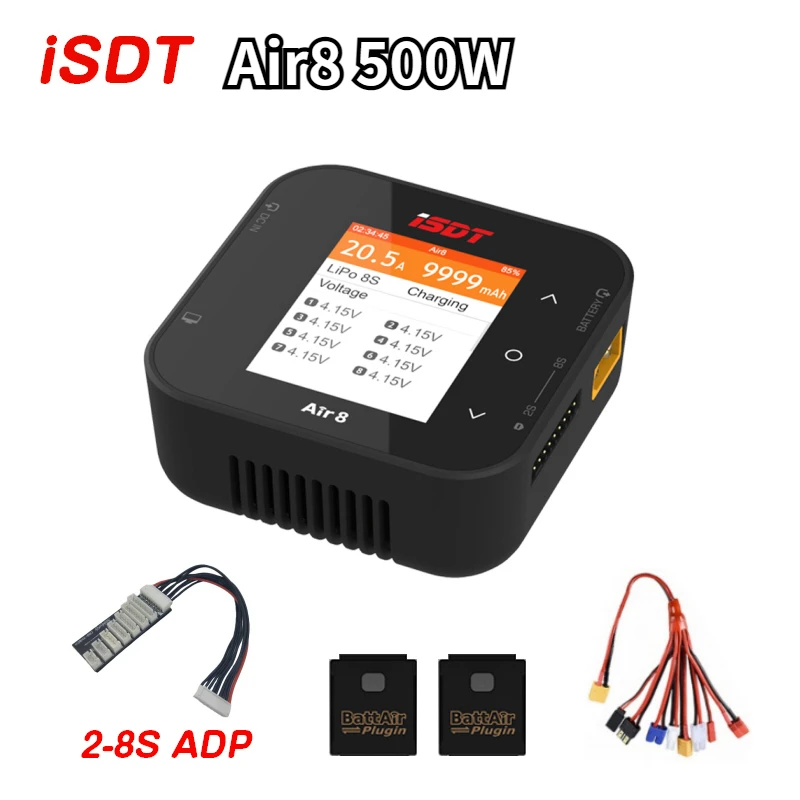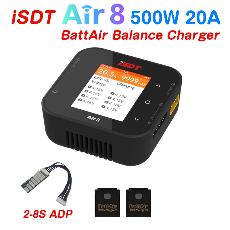 The ISDT Air8 500W 20A charger combines sleek, modern design with advanced functionality, delivering a maximum power output of 500W and supporting charge currents from 0.1A to 20A. Its ergonomic, rounded form features a high-resolution color screen displaying detailed charging information in black text against a vibrant white and orange background, ensuring clarity and ease of use. Compatible with a wide range of batteries including LiFe, Li-ion, LiPo (1-8S), LiHV (1-7S), Pb (1-12S), and NiMH (1-16S), it supports battery balancing and features a durable metal construction. With two included battery balance leads, this device is ideal for RC models and remote control vehicles.