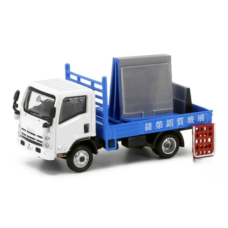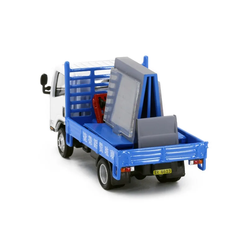 Step into the world of collectibles with this exquisitely crafted diecast model. Measuring about 7 cm long, this 1:76 scale replica captures every detail of the real vehicle. The white cab features realistic black side mirrors, clear plastic windows, and a finely detailed front grille with horizontal slats. The headlights, molded from transparent material, add to its lifelike appearance. The vibrant blue open flatbed cargo area is accentuated with matching safety rails on three sides, and an open rear with a small loading step. Upright on the bed are two large panels, one in a lighter shade simulating glass. Perfect for display, this model combines realism with craftsmanship, making it an ideal addition to any collection or display case.