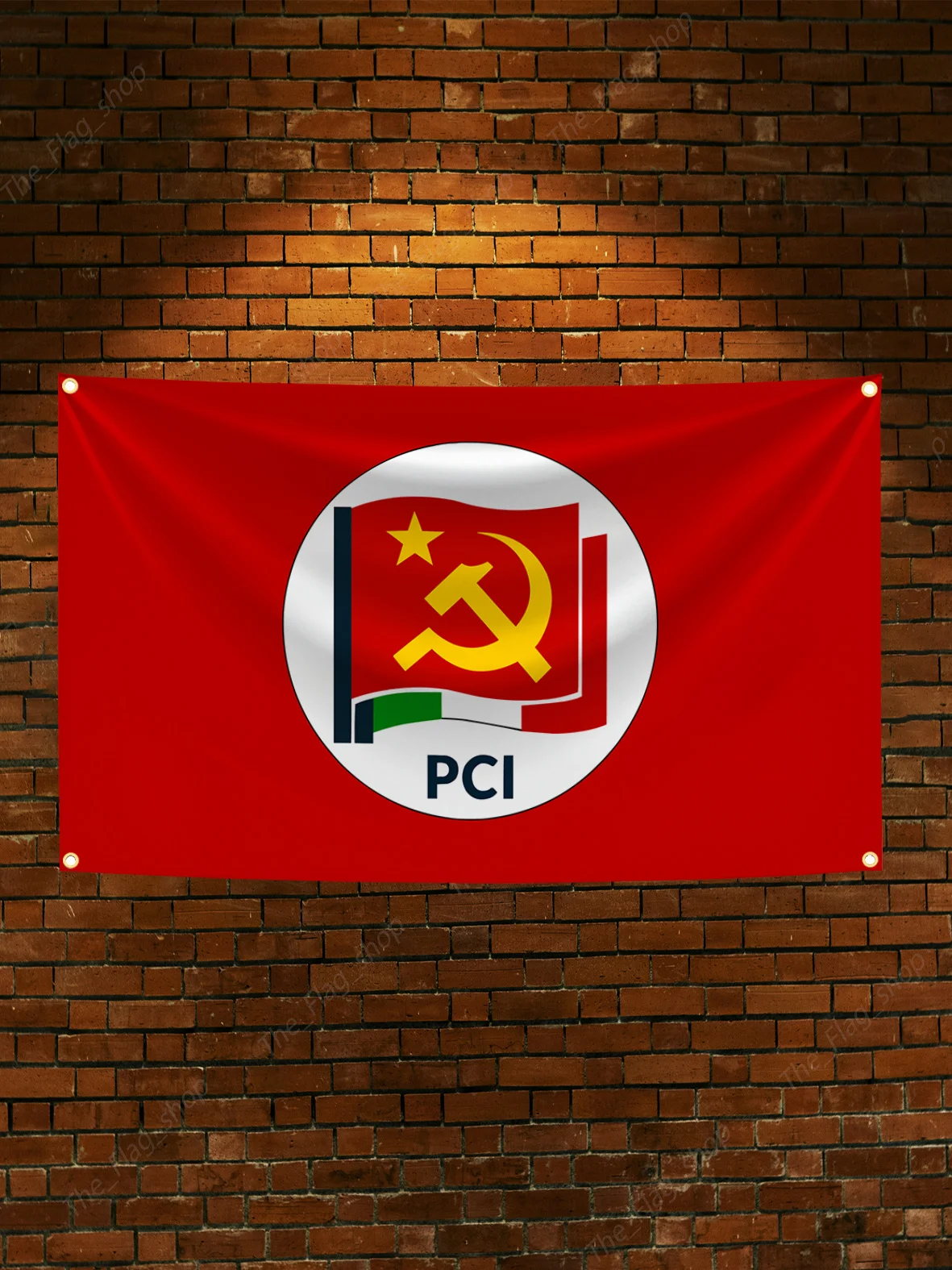 Display your support with this vibrant 90x150cm Italian Communist Party PCI flag, crafted from durable polyester with double penetration printing on sleek Super-Tex fabric. Featuring a bold red background, a central circular emblem with a stylized red flag, yellow hammer and sickle, and the inscription “PCI” in dark blue or black, this flag is perfect for both indoor and outdoor decoration. Reinforced corner eyelets ensure secure hanging, available in either two holes on the shaft cover or four corner holes. Lightweight at 80 grams, it offers a striking, authoritative look to showcase your political or cultural pride effortlessly and reliably.