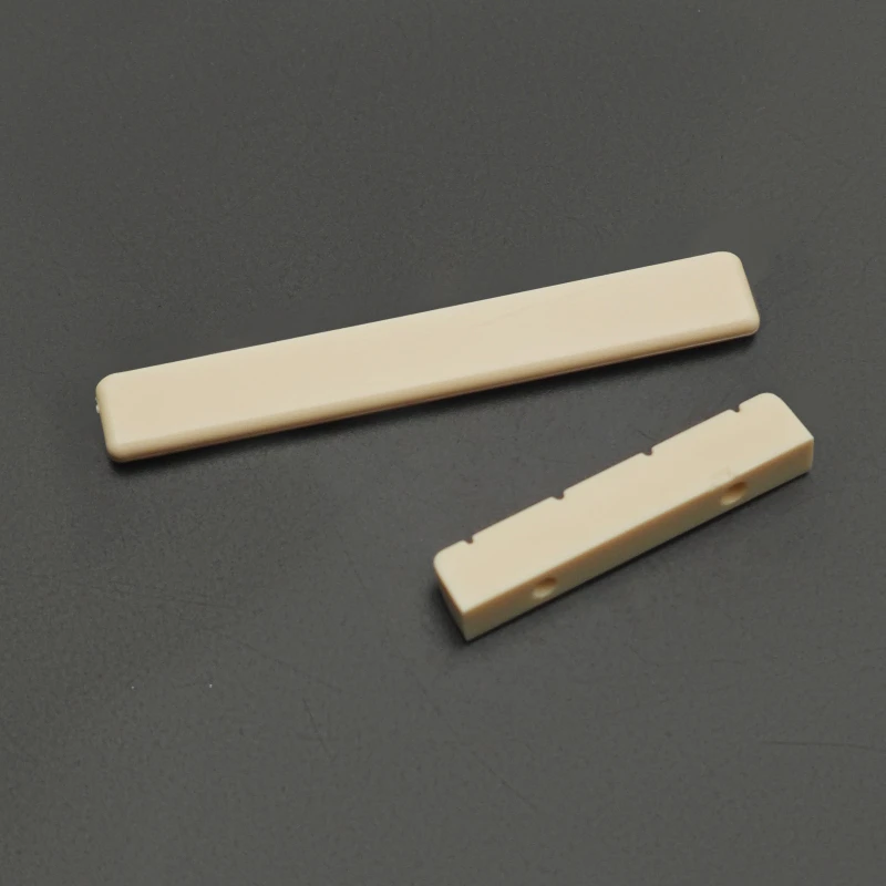 Enhance your ukulele or four-string Hawaiian guitar with this set of 100 high-quality plastic components, including 50 ivory-colored nuts measuring 35 x 5 x 6.5 mm and 50 saddles of 60 x 3 x 8-7.8 mm. Designed for seamless compatibility with most ukulele models, these durable, smooth, and slightly glossy parts feature precise notches and grooves for optimal string placement and height adjustment. Perfect for replacements or custom setup, these functional yet minimalist pieces offer a polished finish and reliable performance, helping you achieve excellent sound quality and playability in your instrument.