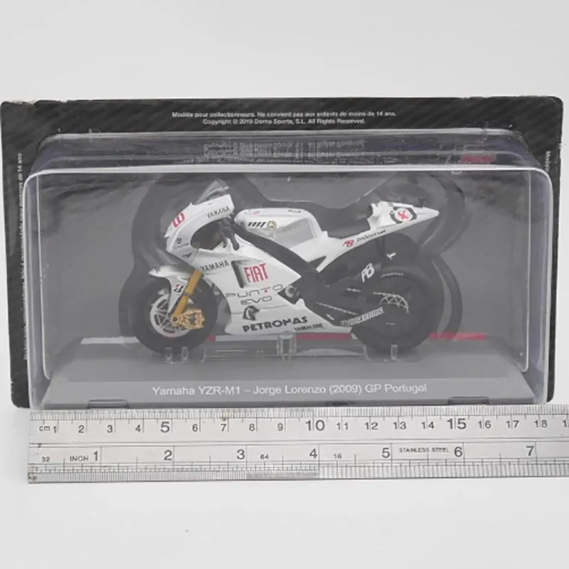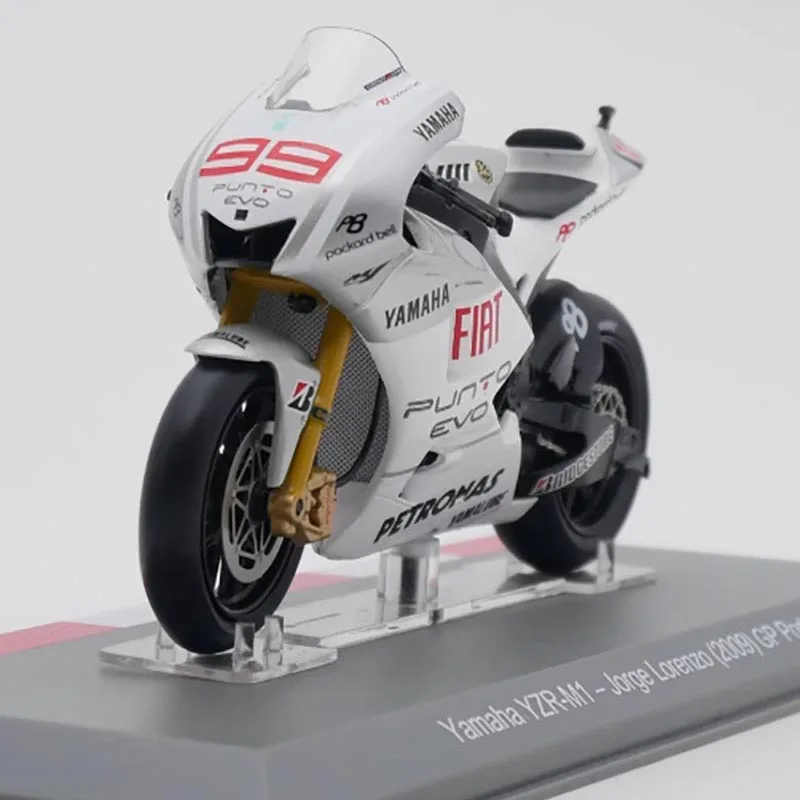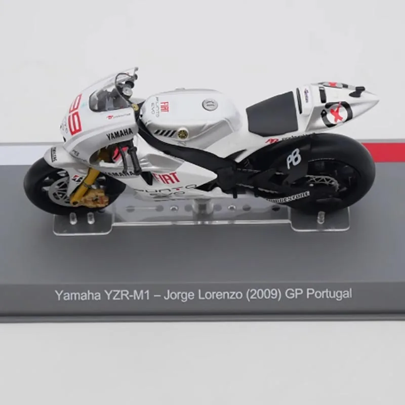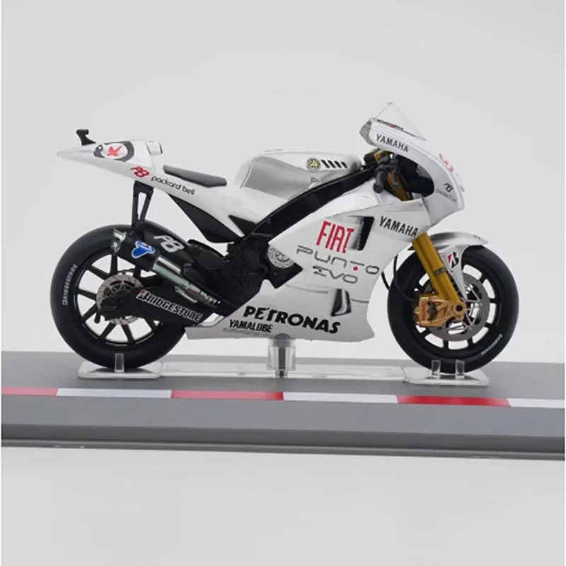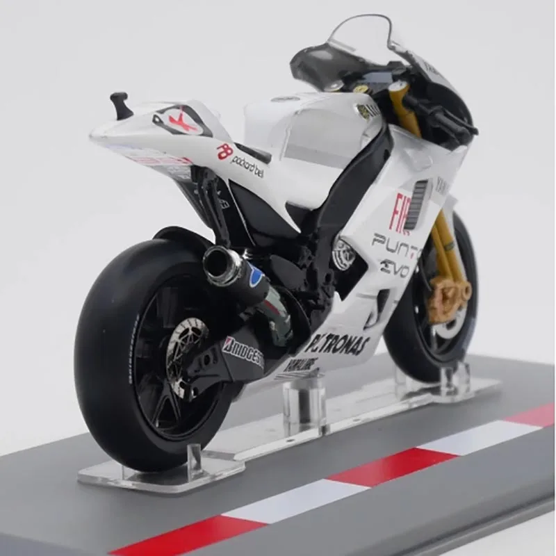 The IXO 1:18 Yamaha YZR-M1 motorcycle model is a beautifully crafted collectible that captures the essence of the iconic race bike from the 2009 season. Constructed from high-quality alloy and plastic, this model features a dynamic color scheme with a glossy white body complemented by striking red and black accents. Every detail, from the aerodynamic design to the prominent sponsorship logos like “Yamaha” and “FIAT,” reflects authenticity. Perfect for displaying in your collection or as a thoughtful gift, this model embodies passion for motorcycle racing and admiration for its design excellence.