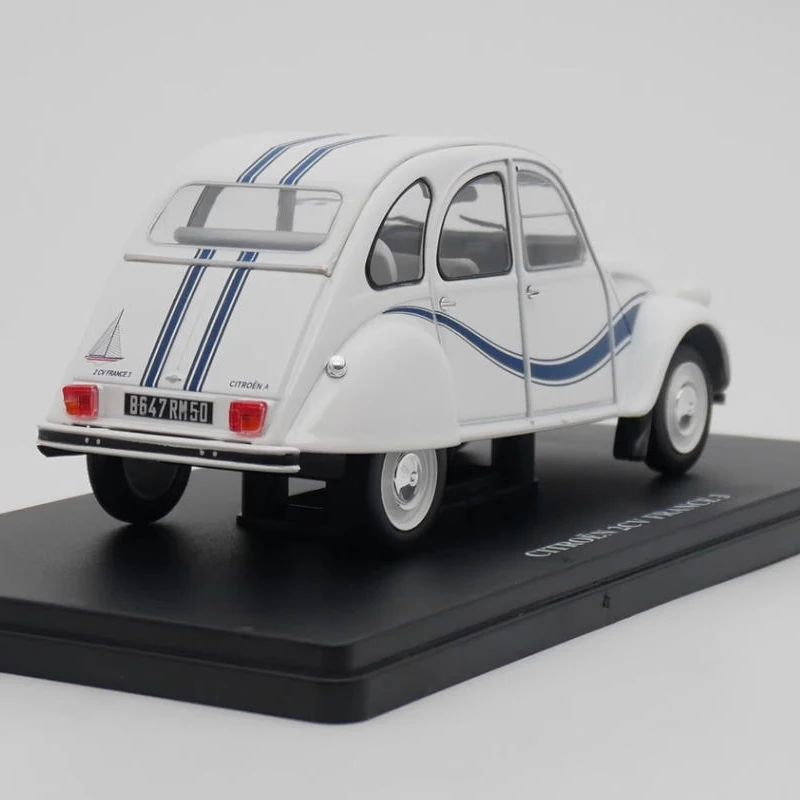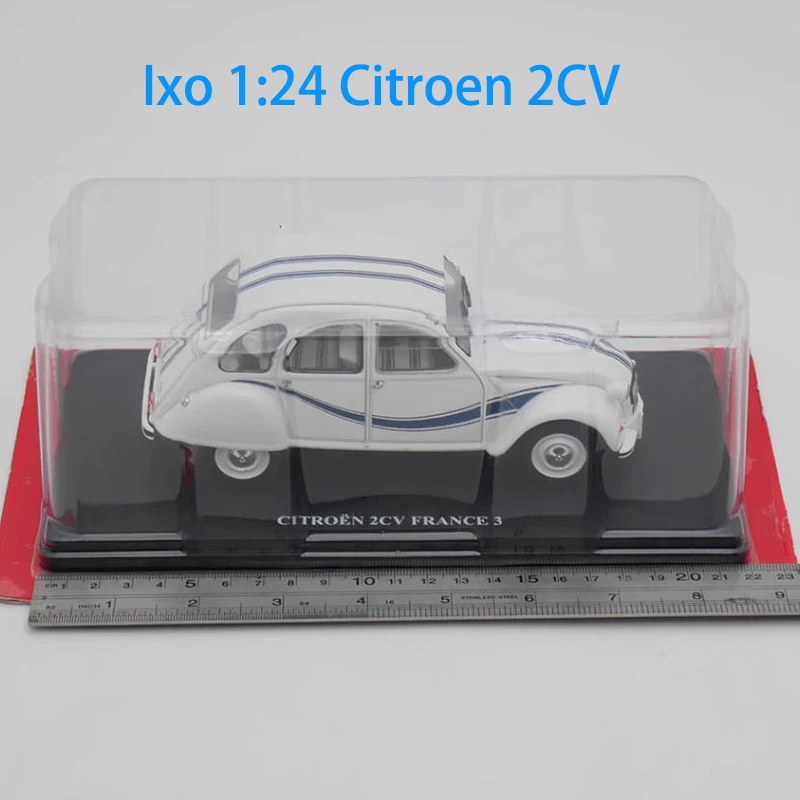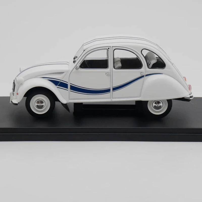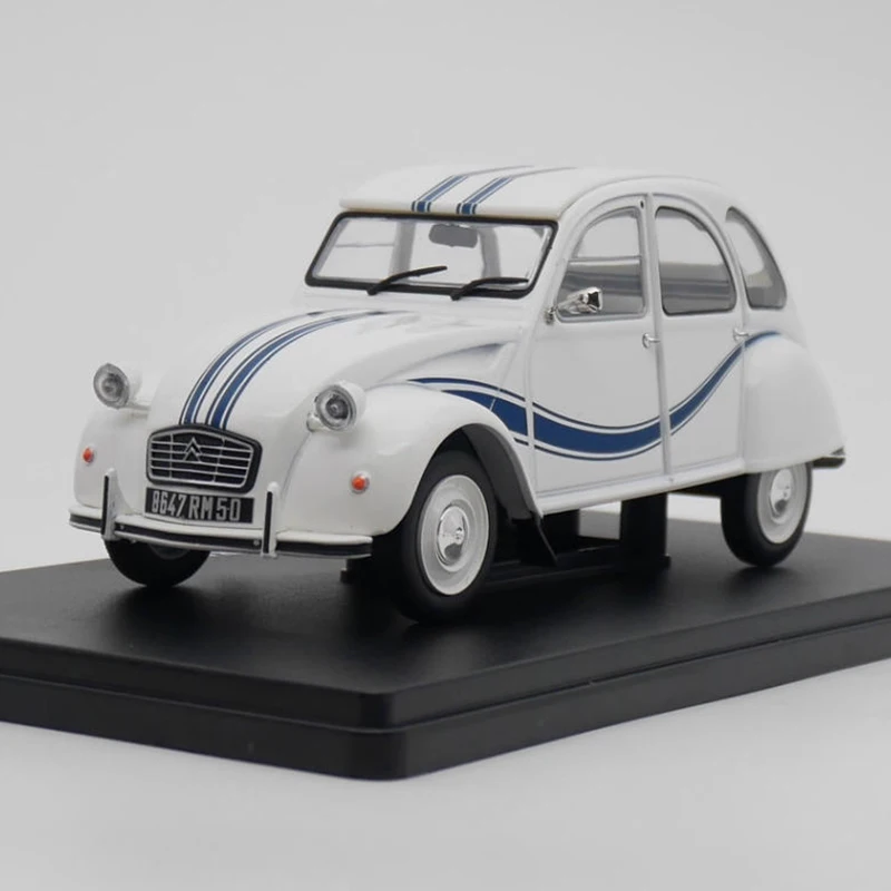 The Ixo 1:24 Citroen 2CV Alloy Model is a beautifully crafted diecast replica featuring a predominantly white body with striking blue stripes. Constructed from durable alloy and plastic, this model captures the vintage essence of the iconic Citroen 2CV with intricate details, clear windows, and realistic wheels. It is presented in a rectangular clear plastic display case supported by a sleek black base with a red border, enhancing its visual appeal. Measuring 1:24 in scale, this static display item is perfect for collectors and serves as an elegant gift decoration. Ideal for showcasing or adding to any collection.