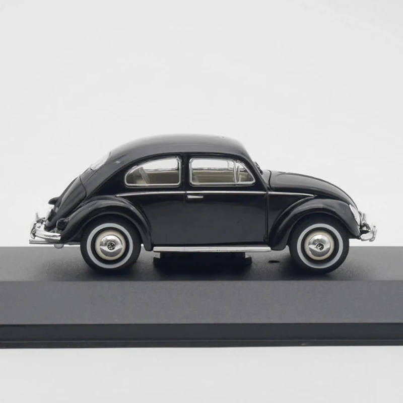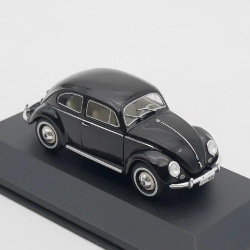 The Ixo 1:43 Kafer 1200 Ovali 1955 diecast model car captures the spirit of the iconic Volkswagen Beetle. Drenched in glossy black, this model features the rounded design and smooth curves that represent the classic aesthetic perfectly. The transparent windows of the model reveal a simplistic, light-colored interior, while the intricately designed wheels boast spokes and vintage whitewall tires, enhancing its nostalgic look. Crafted from high-quality metal, this model has a substantial feel. It is meticulously detailed and set upon a black plastic base that highlights the car's identity, making it an ideal choice for collectors or as a decorative piece.