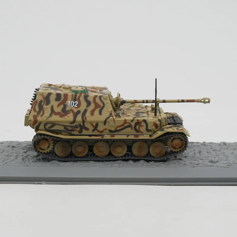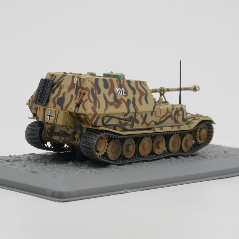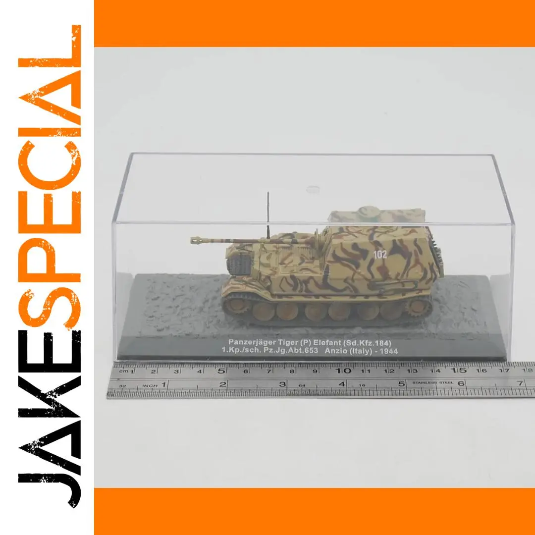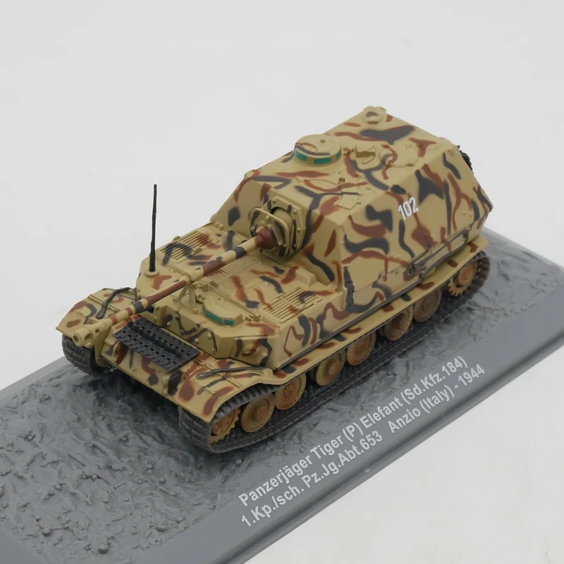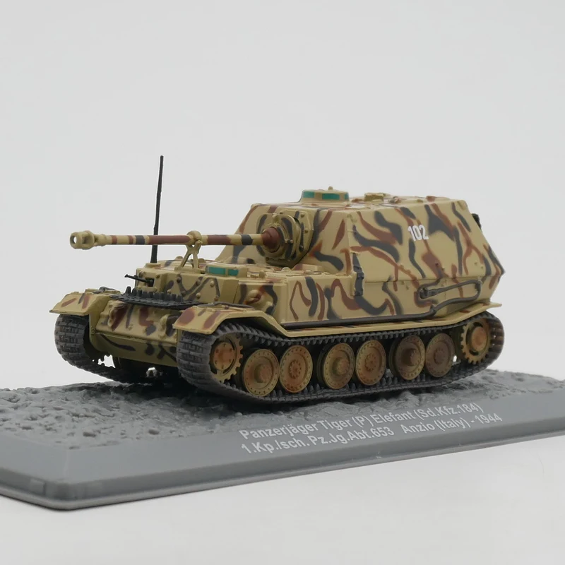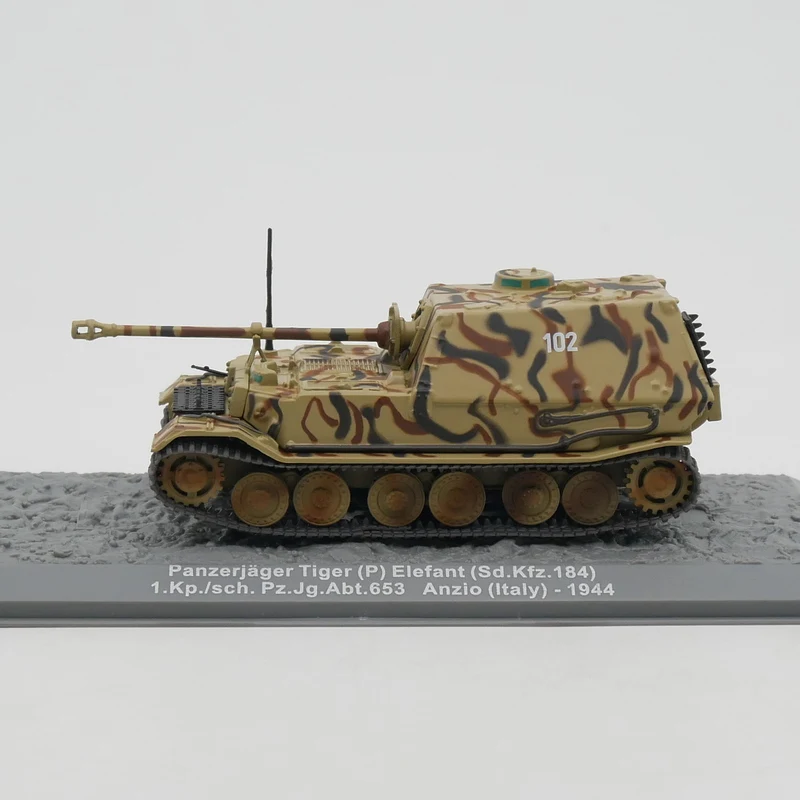 Experience the detailed craftsmanship of this Diecast Ixo 1:72 Scale Sd.Kfz.184 Panzerjäger Tiger (P) Elefant tank model, designed to replicate its authentic WWII appearance. Adorned with a camouflage pattern in shades of brown, tan, and green, it captures the essence of the original vehicle used during the 1944 Anzio campaign. Perfect for display, this model includes the identifying number “102 inches on its side and sits on a textured base to replicate real terrain. Encased in a clear protective box, this collectible will undoubtedly steal the spotlight in any collection, making it an ideal piece for enthusiasts and historians alike.