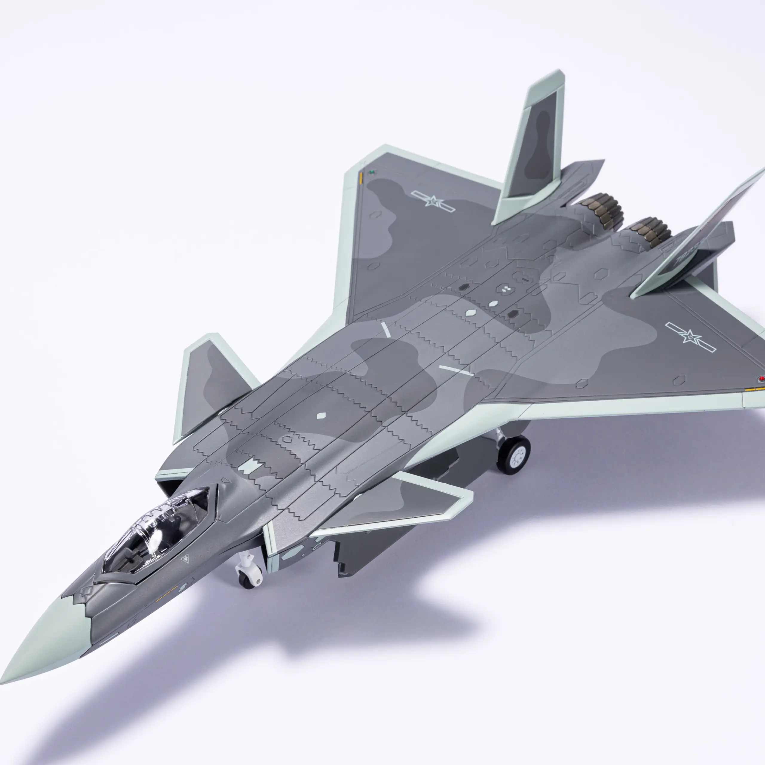 - Authentic representation of the J-20 stealth fighter, detailed with panel lines, decals, and camouflage accents, capturing its modern and aggressive appearance for display and collection purposes.