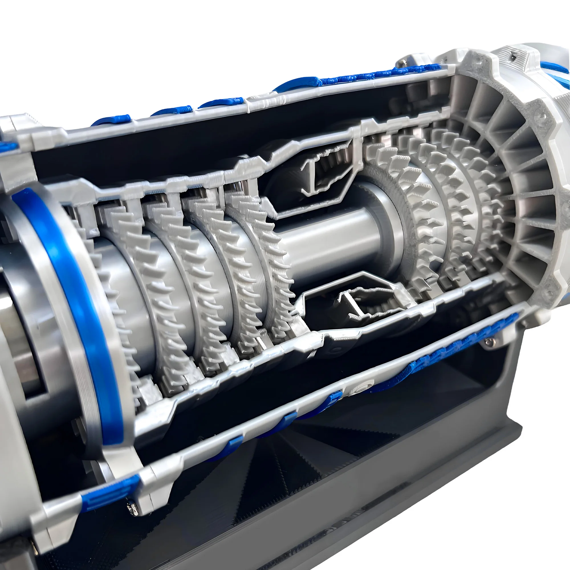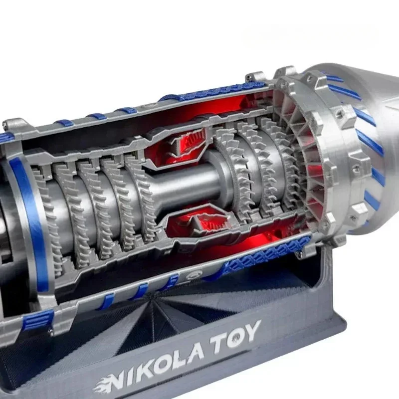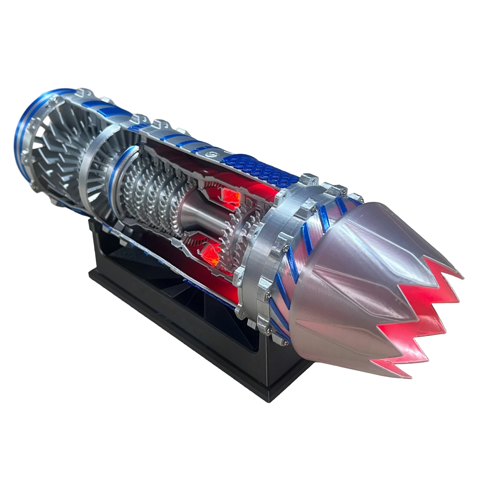 This detailed J-35A fighter jet turbojet engine model measures 26 cm in length, 8 cm in width, and 10 cm in height, weighing approximately 600 grams. Crafted from high-quality PLA plastic, it features a sleek aeronautical design in blue and white tones, with intricate paneling, tiny bolts, and a circular turbine intake with gray blades. The model includes a conical tail flame detail and is mounted on a black stand for optimal display. Powered by 2 AA batteries, this unisex air show demonstration toy offers a realistic and educational representation of a fighter jet engine, perfect for collectors, aviation enthusiasts, or educational demonstrations.