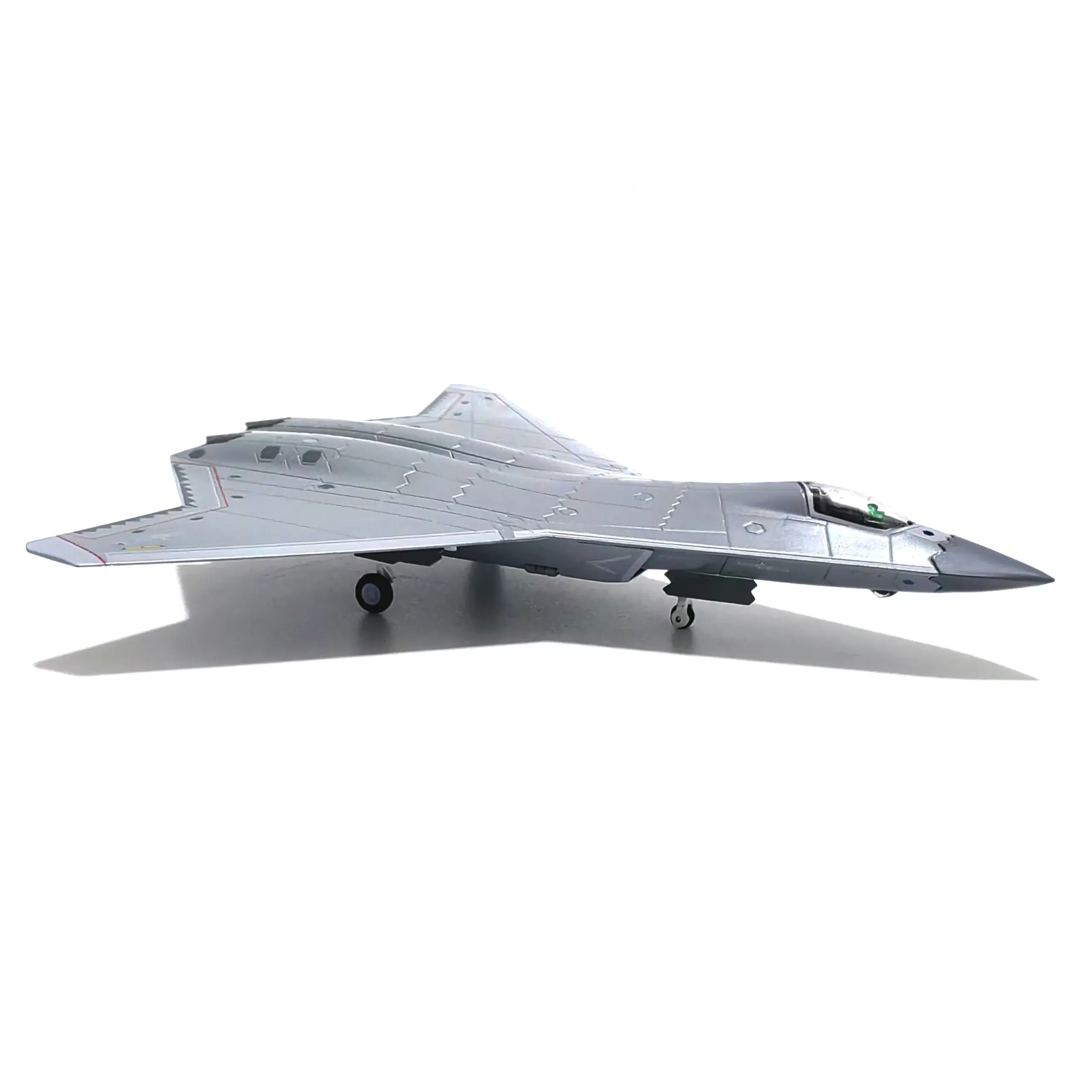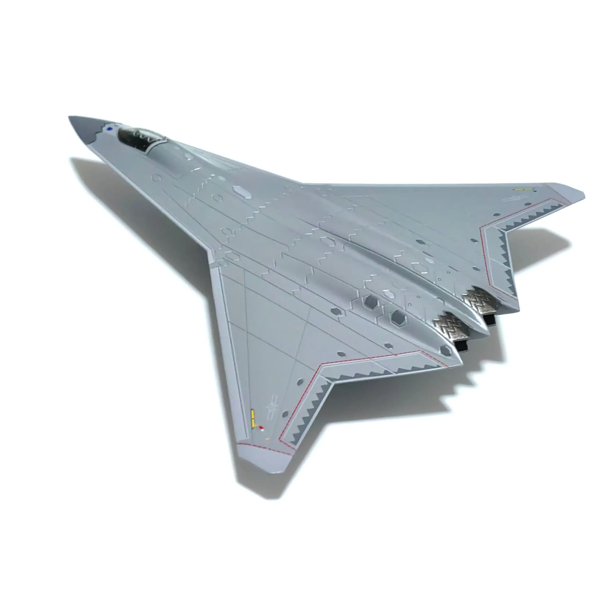 - Features intricately painted details like rivets, panel lines, and surface features, emphasizing its sophisticated, miniature fighter jet appearance and aerodynamic shape.