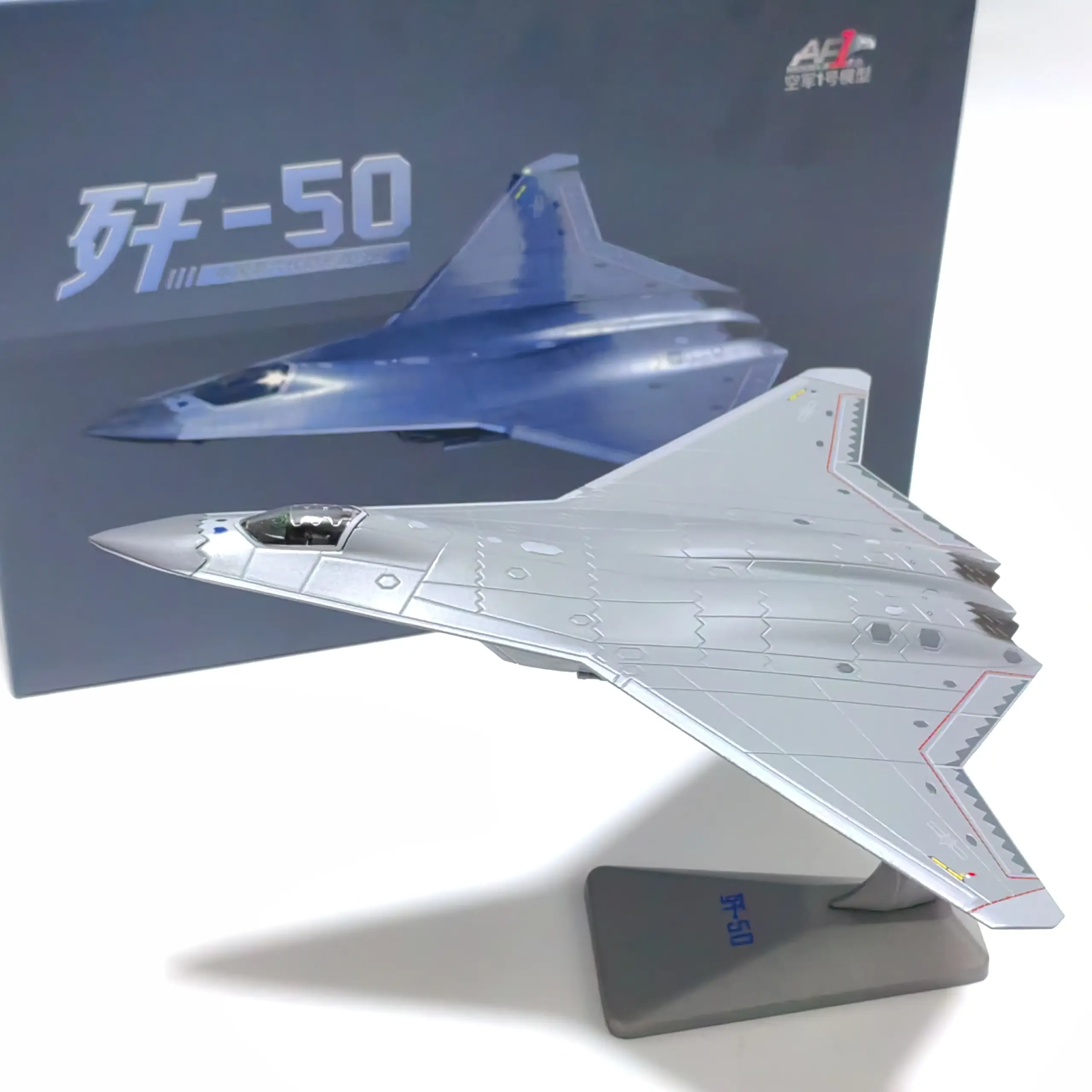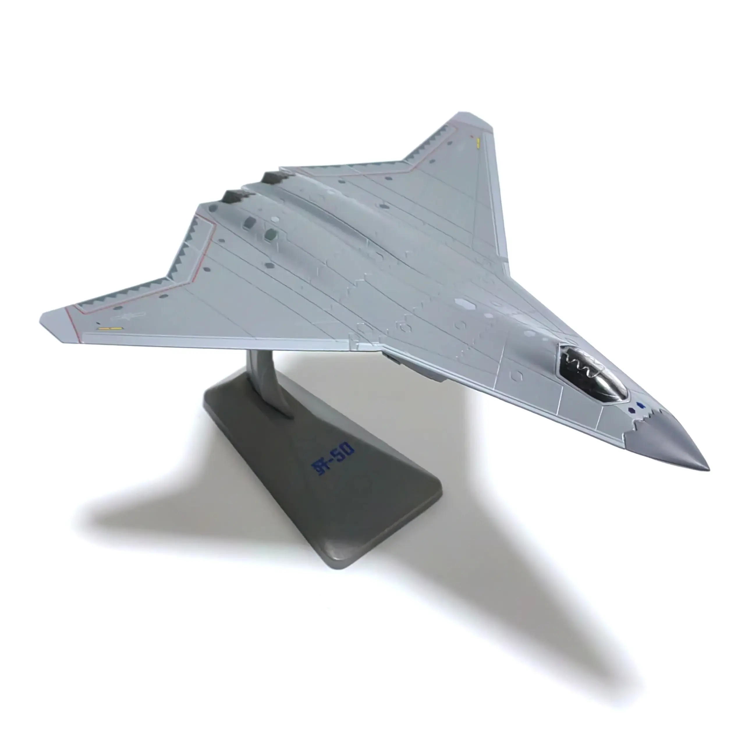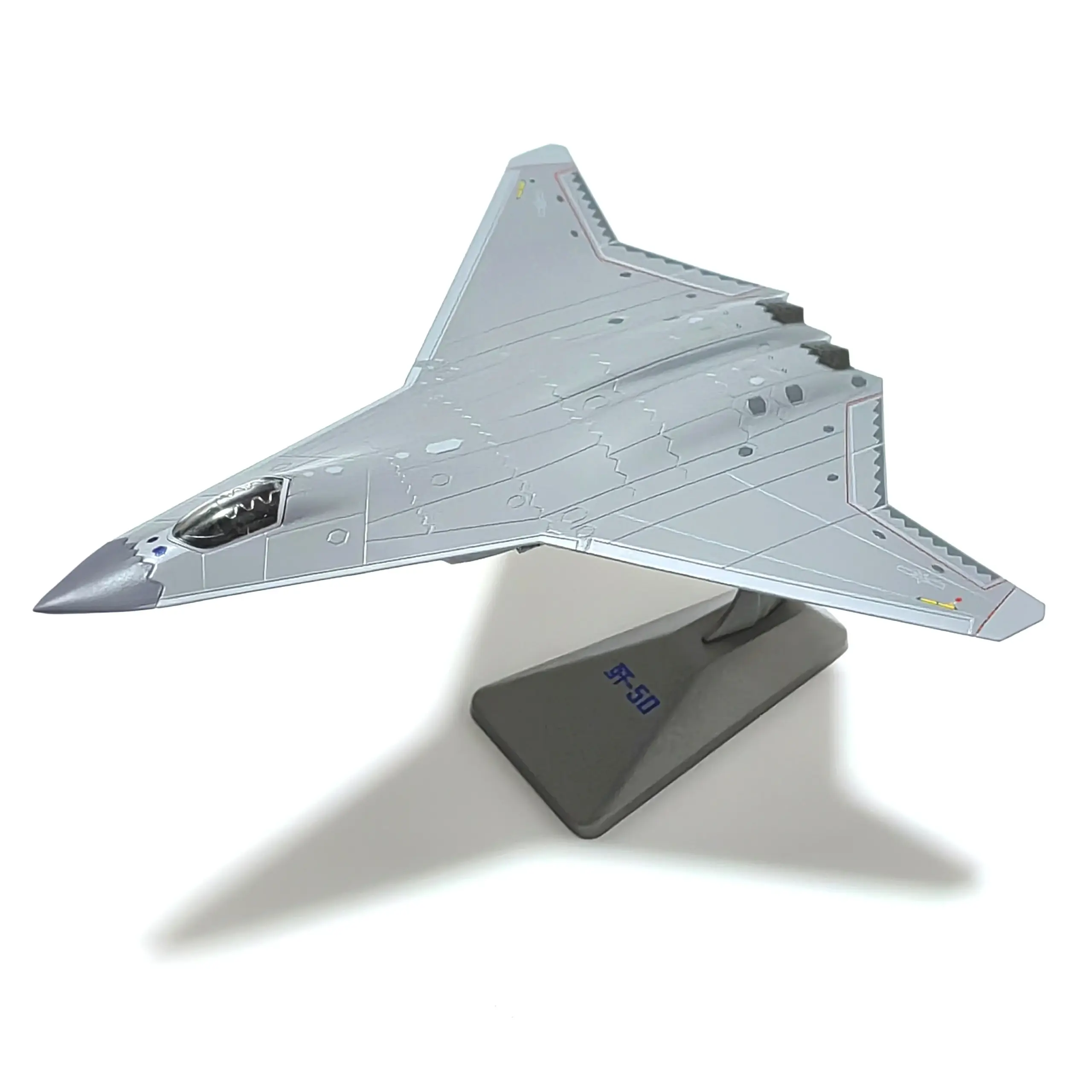 Imagine yourself showcasing this stunning J50 scale model, capturing the sleek, aerodynamic design of a fighter jet with precise metallic detailing. Its polished silver surface reflects light beautifully, highlighting sharp angles and intricate surface features like panel lines, rivets, and surface textures. The delta-wing configuration and pointed nose emphasize its aggressive, modern style, making it an eye-catcher on any display shelf. The darkened transparent canopy reveals a minimalist cockpit interior, adding realism. Supported by a sturdy stand, the model is displayed at an engaging angle that accentuates its dynamic silhouette. Small weathering marks enhance authenticity, making this piece both a stunning decor and a tribute to aviation craftsmanship. This model invites admiration and sparks conversation, perfect for avid collectors and military enthusiasts alike.