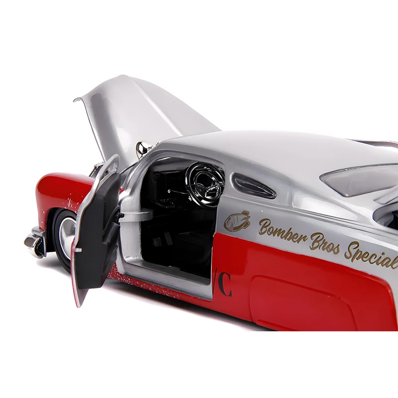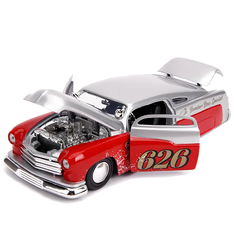 Imagine owning a stunning diecast replica of the 1951 Mercury, meticulously designed to capture the essence of classic automotive craftsmanship. This impressive 1:24 scale model showcases a striking two-tone design, with a bright red body and a shiny silver roof that glints under the light. Its chrome grille and round headlights enhance the nostalgic vibe, while the bold “626” and “Bomber Bros Special” detailing give it an authentic racing flair. Crafted from quality alloy and plastic, this collectible is ideal for display or play, offering an engaging way to connect with automotive history.