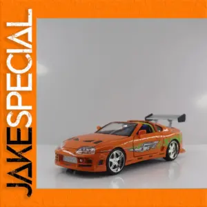 Experience the thrill of the Fast and Furious franchise with this stunning 1:24 scale diecast model car of Brian’s 1995 Toyota Supra. Crafted from high-quality metal alloy, this vibrant orange model boasts a glossy finish that captivates the eye. The intricate grille, clear headlights, and sporty black decals enhance its authentic appearance. Eye-catching green accents and a stylized wing logo adorn the sides, while shiny chrome five-spoke wheels provide a sleek look. The model features a prominent rear spoiler, accurate rear lights, and a striking blue interior, making it a captivating collectible for any enthusiast.
