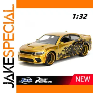 Experience the thrill of the JADA 1:32 scale model car featuring the impressive 2021 Charger SRT Hellcat. This stunning diecast vehicle boasts a glossy gold finish, complemented by an aggressive front grille with a black mesh pattern. The sporty design features two prominent air scoops on the hood, bold black graphics with abstract shapes, and a stylized skull on the sides. The car’s striking look is enhanced by large wheels with gold rims and clear plastic windows that showcase a detailed interior. Crafted from durable alloy and plastic, this non-electric model is a perfect collectible for enthusiasts aged 14 and above.