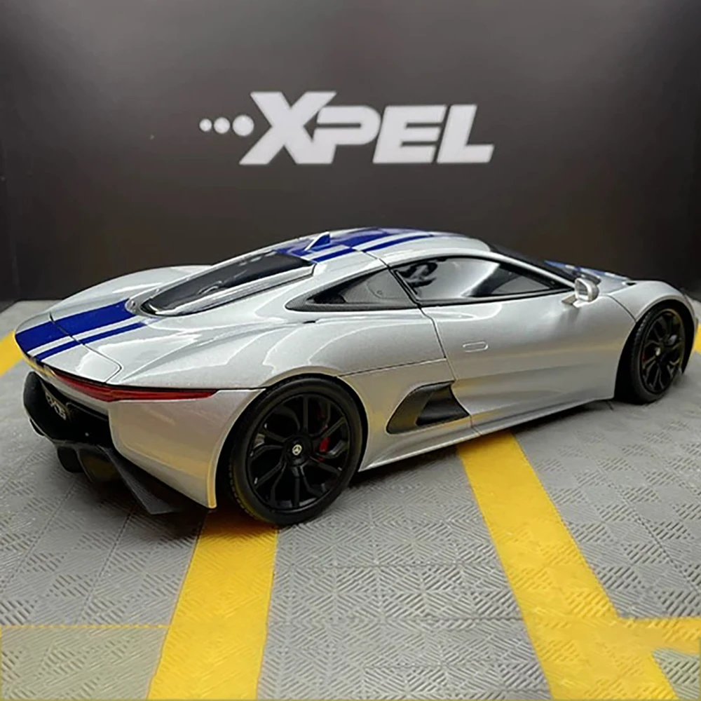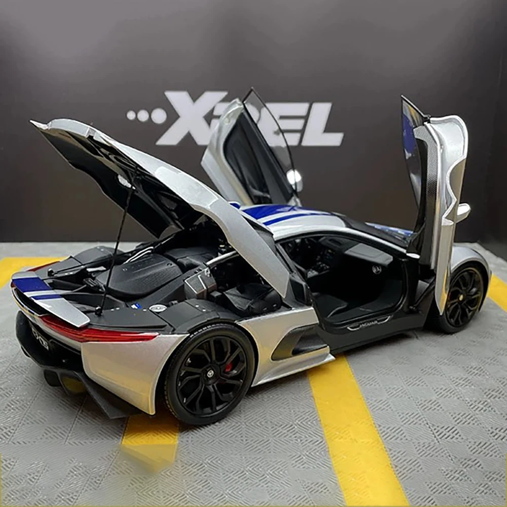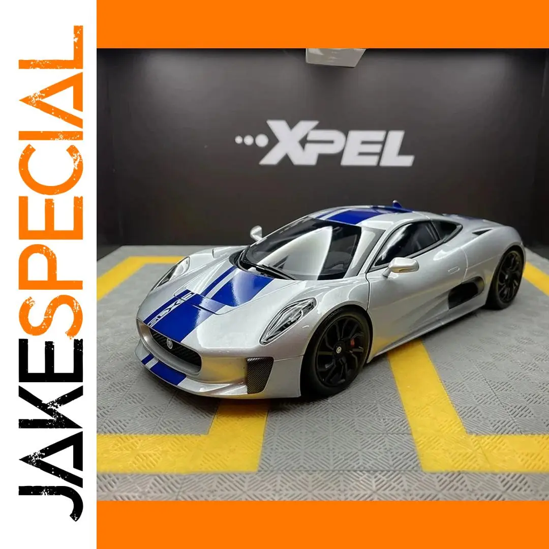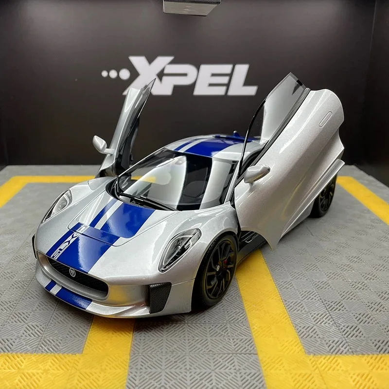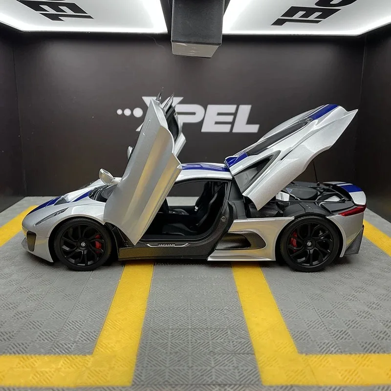 Bring home the sleek elegance of this masterfully crafted 1:18 scale die-cast alloy car model of the Jaguar Cx75 2013 Limited Edition. Meticulously designed, this high-quality miniature captures the essence of the original with its aerodynamic silhouette, flowing lines, and meticulous details. The glossy silver finish accented by a distinctive blue racing stripe running from the hood over the roof to the rear truly highlights its sporty character. Constructed from alloy, ABS, and rubber, it offers a durable and realistic look. The model features functional doors that open smoothly, an openable trunk lid, and wheels that rotate seamlessly. It’s an ideal piece for collectors, enthusiasts, or as a sophisticated gift for anyone who appreciates fine automotive craftsmanship.