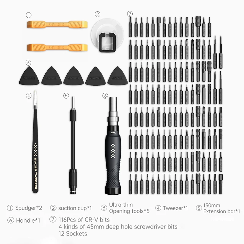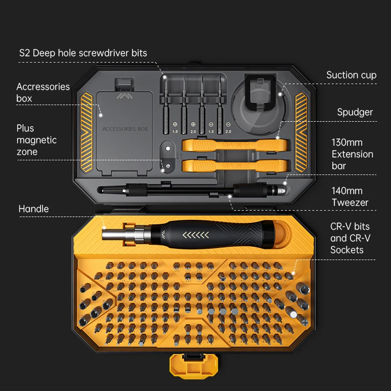 The JAKEMY 145-in-1 magnetic screwdriver set model JM-8183 combines practicality and precision, crafted from durable chrome-vanadium steel. It features a built-in 130mm adjustable extension bar, an organized storage box, and a magnetic zone for easy bit handling. The set includes 116 CR-V bits, 12 CR-V sockets, and 4 S2 45mm deep hole screwdriver bits, covering a wide range of screw types such as Phillips, flat-head, Torx, Tri-wing, pentagon, U-shaped, triangle, square, and specialized bits like PZ and SIM ejector. Its ergonomic design ensures comfort during extended use, making it ideal for mobile phone, tablet, laptop, and electronic device repairs, all in a meticulously organized, versatile kit.