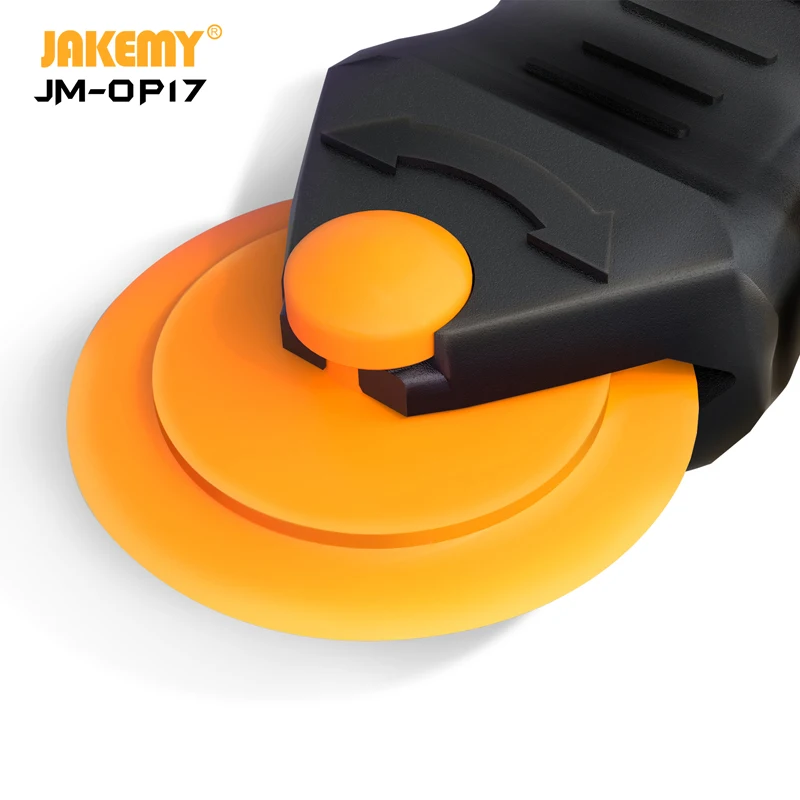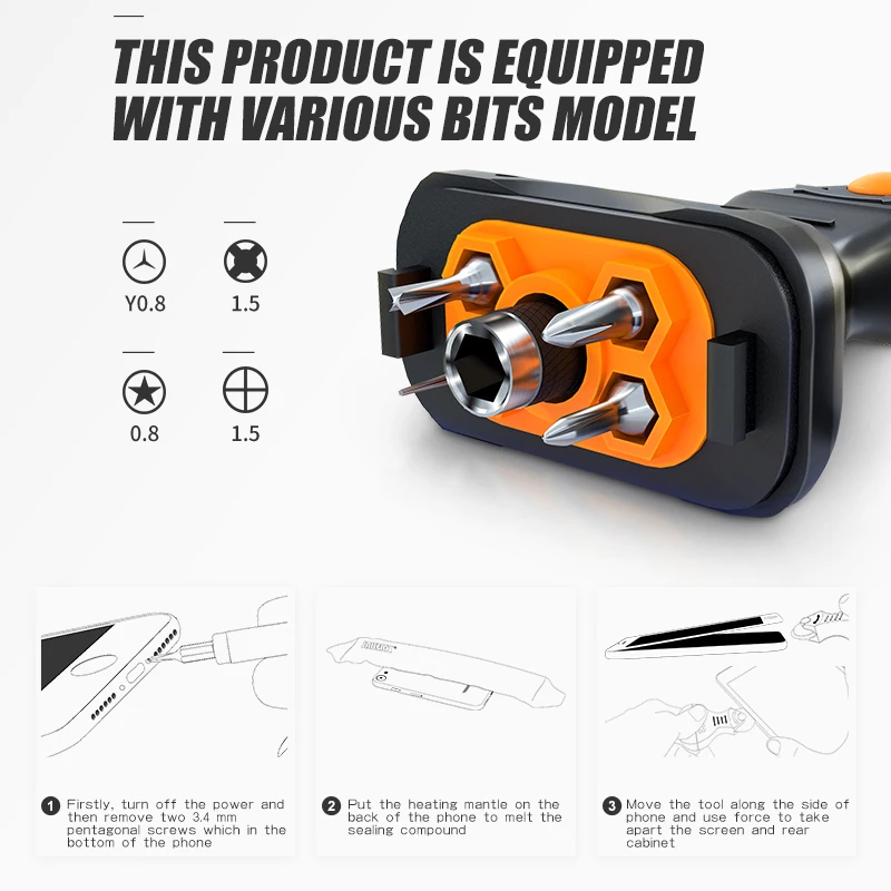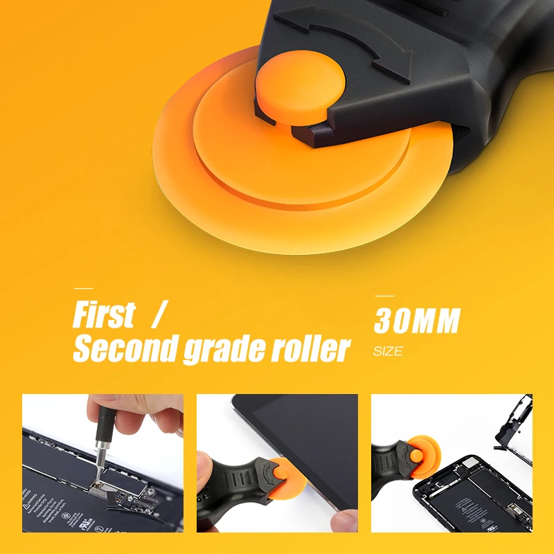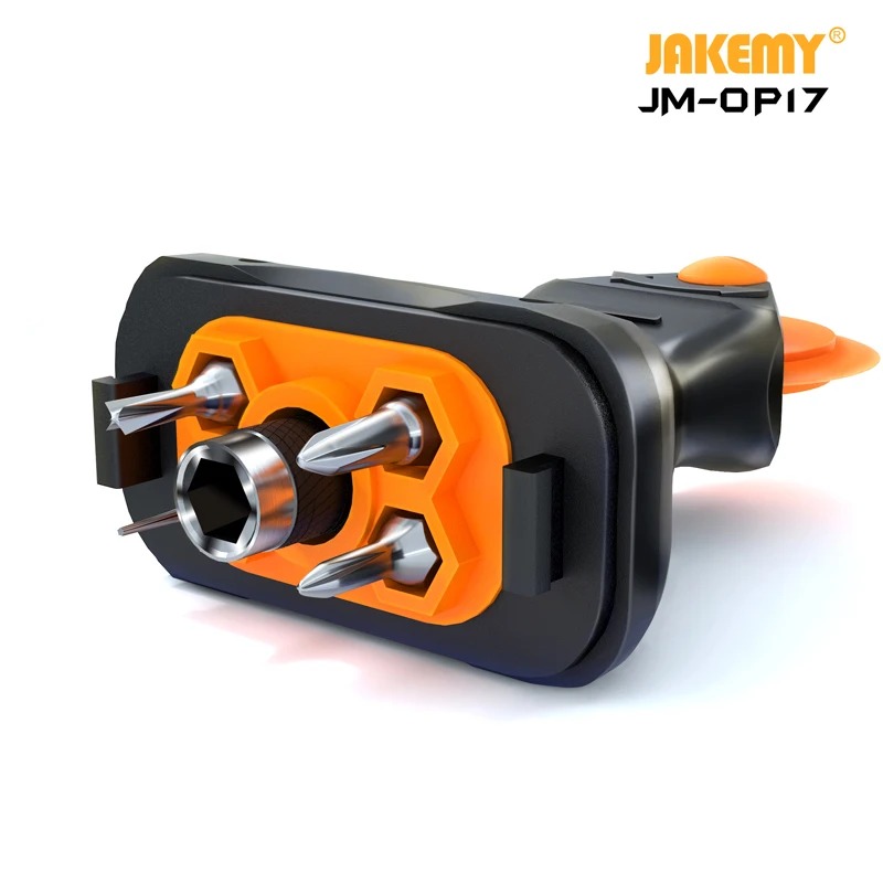 Experience precise and efficient iPhone LCD disassembly with the JAKEMY JM-OP17 9-in-1 screwdriver kit, featuring durable CR-V bits and a compact roller opener. The ergonomic, black and vivid orange handle measures 75mm x 25mm x 45mm, offering a comfortable grip for detailed repair work. The set includes four metallic bits with a shiny, industrial finish, a vibrant orange roller opener designed to pry screens safely, and an assortment of tools neatly organized for quick access. Perfect for electronics enthusiasts and DIYers, this multifunctional toolkit provides a professional-grade solution for household device repairs, combining style, durability, and practicality in one sleek package.