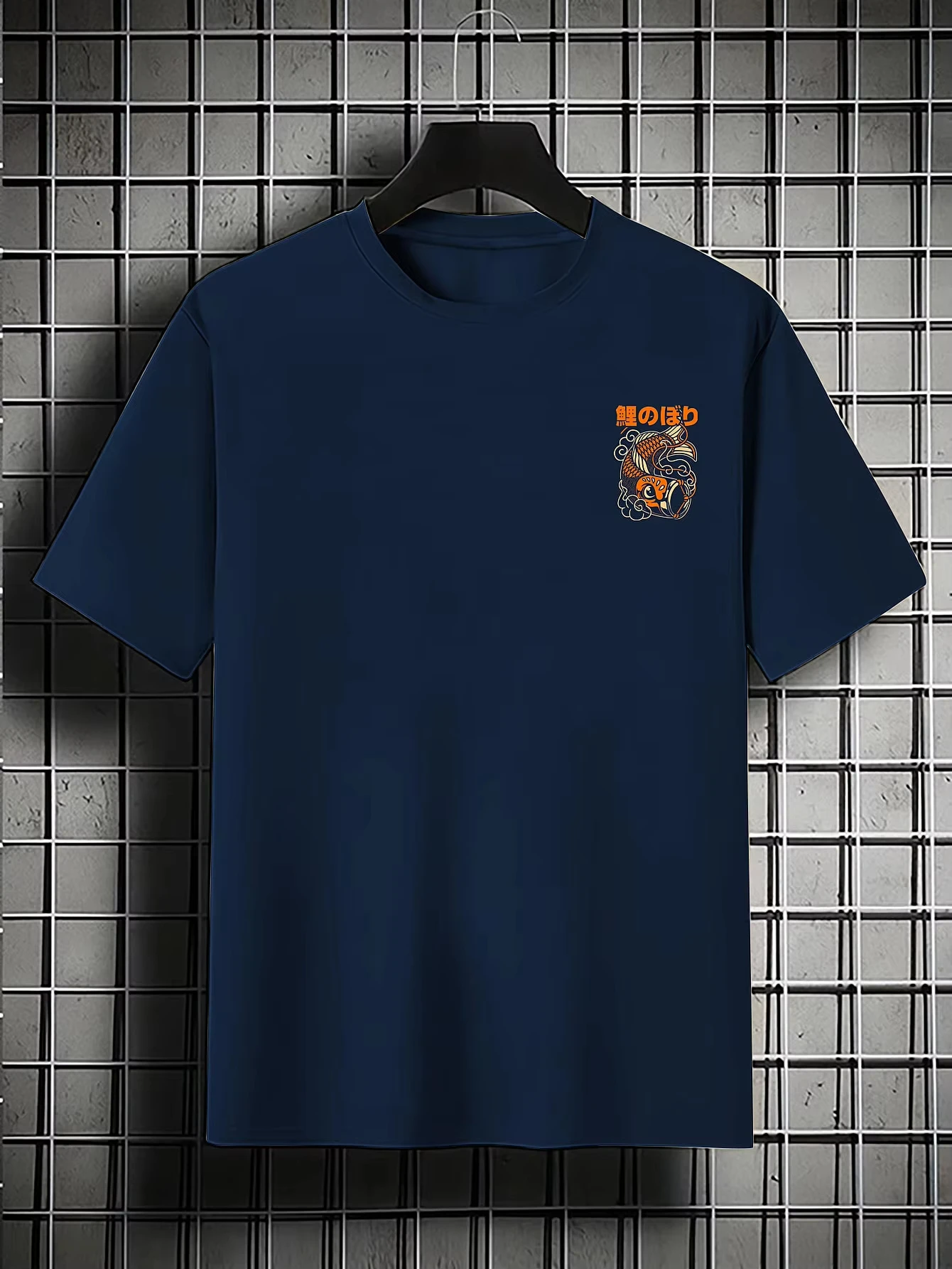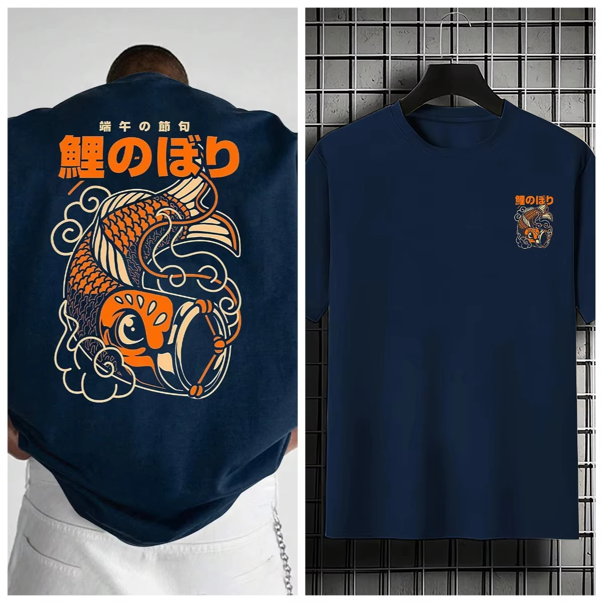 Imagine yourself wearing this vibrant and artistic T-shirt, perfect for adding a bold touch to your casual wardrobe. Crafted from breathable, lightweight cotton, it offers maximum comfort throughout the year. The eye-catching design features a striking orange and cream koi fish swimming amidst stylized clouds and water motifs, set against a deep navy background. Large Japanese characters adorn the top, creating a perfect blend of traditional and modern aesthetics. Its well-finished construction ensures durability and a sleek silhouette. Whether you're on a trip or enjoying everyday activities, this T-shirt brings style and cultural elegance into your life. Embrace comfort without sacrificing your bold fashion sense with this unique garment.
