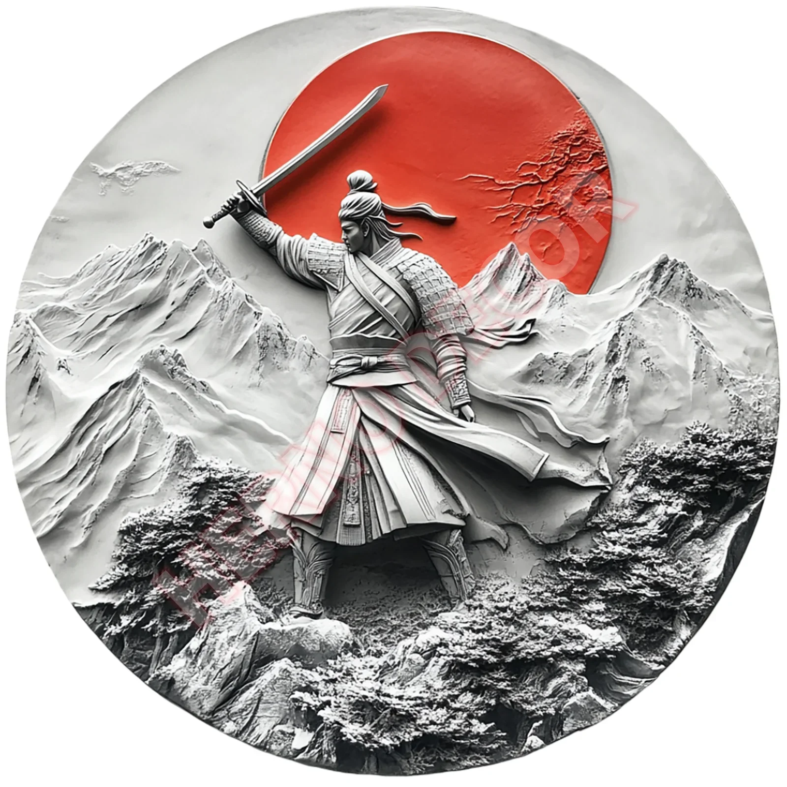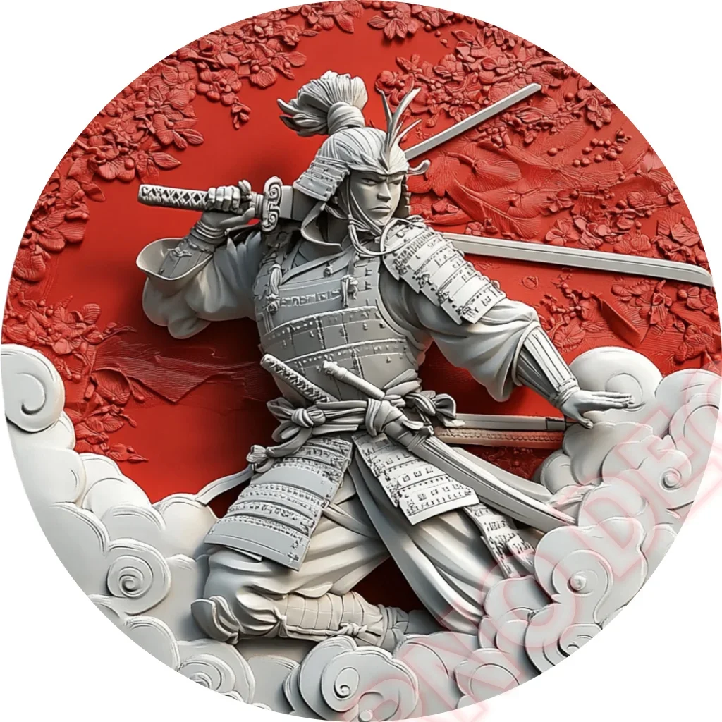 - Features a detailed silhouette of a samurai in traditional armor, set against a vibrant red circular background.
