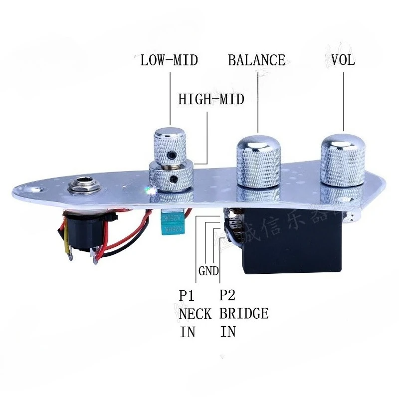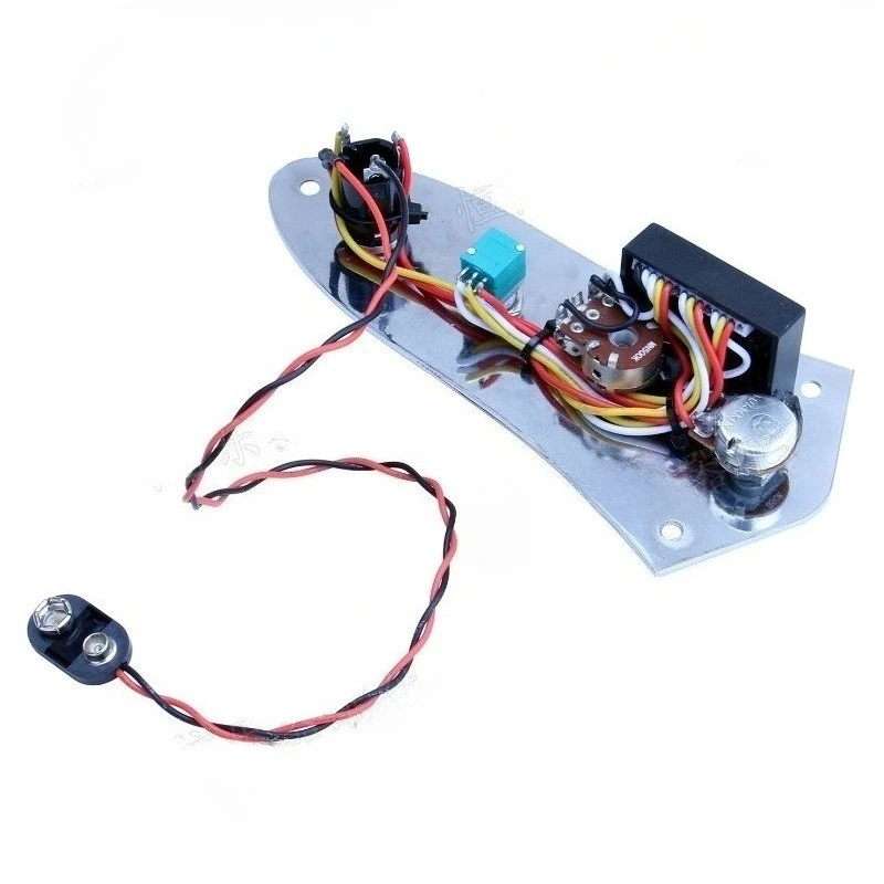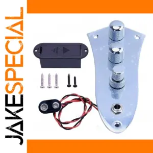 Enhance your electric bass guitar with this prewired control circuit plate in JB-09CR color, featuring a sleek, highly polished chrome finish in a shield or teardrop shape. It includes four textured, metallic knobs for precise volume and tone adjustments, and a black plastic switch for pickup selection or control. The assembly also contains a black and red wire connector with two terminal sockets for seamless electronic connections, along with three mounting screws—two silver and one black. Crafted with modern, refined design elements, this high-quality replacement electronics board ensures reliable performance and easy installation for a professional upgrade of your bass guitar’s electronics.