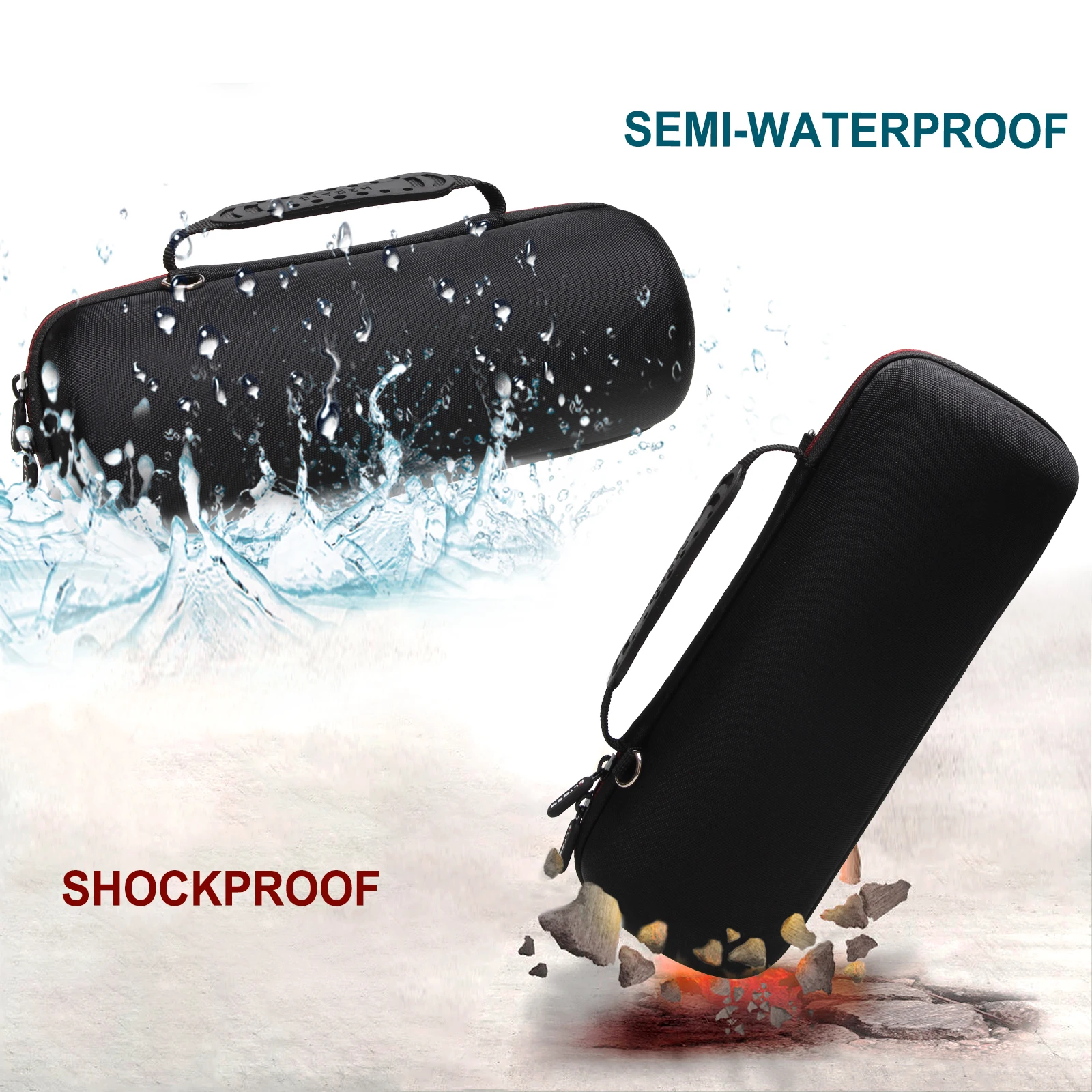 Protect and transport your JBL CHARGE 5 portable Bluetooth speaker with this custom-fit EVA carrying case. Crafted from durable, shockproof, semi-waterproof, dustproof, and wear-resistant material, it ensures reliable protection against impacts and light water exposure. The compact design features a textured black exterior with subtle red stitching along the zipper and an internal patterned foam lining to absorb shocks. Equipped with a comfortable handle, this lightweight case provides ample space for the speaker, keeping it secure during travel. Please note, the case is sold separately and is designed specifically for the JBL CHARGE 5, offering a stylish, practical solution for your portable speaker needs.