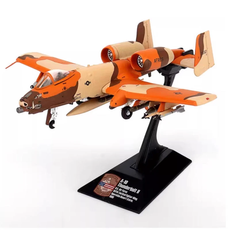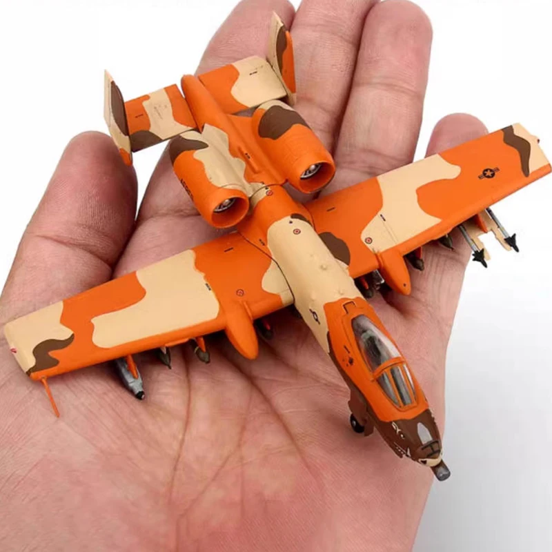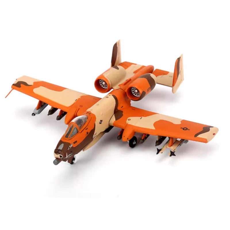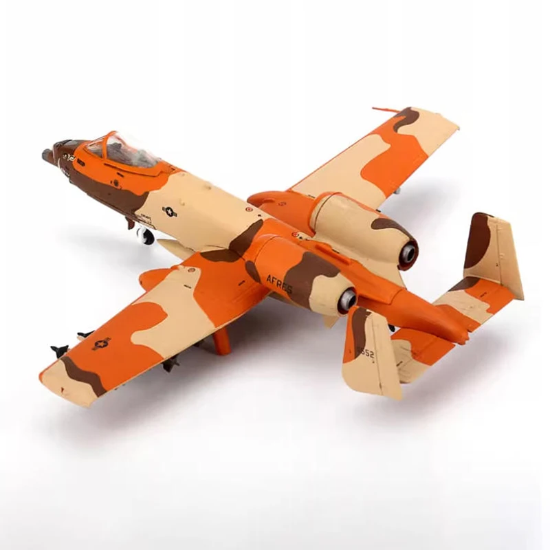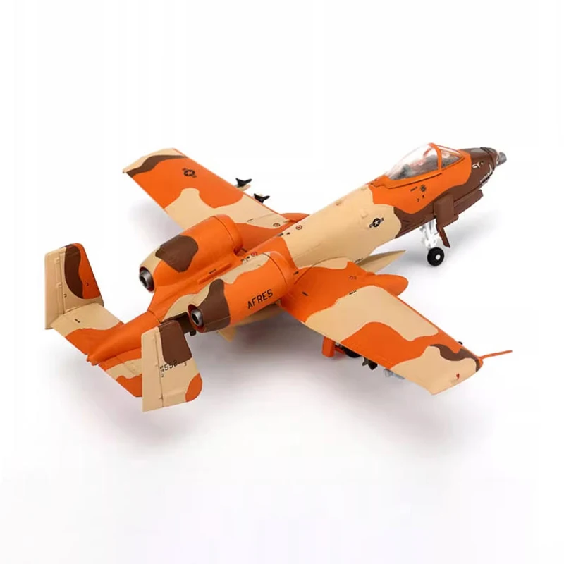 The JC WINGS 1/144 Scale US Air Force A-10 Warthog Attack Model Aircraft is a stunning military collectible, featuring a striking orange camouflage pattern with shades of tan and brown. Standing at 7 cm tall with an 11.5 cm wingspan and 12 cm in length, this detailed diecast model showcases an intricately designed cockpit, angled wings, and realistic engine nozzles. The model is equipped with various antennae, enhancing its authenticity, and is displayed on a sleek black stand, making it an impressive ornament for aviation enthusiasts and collectors alike. Made from alloy and PVC, this durable piece is perfect for display on shelves or desks.