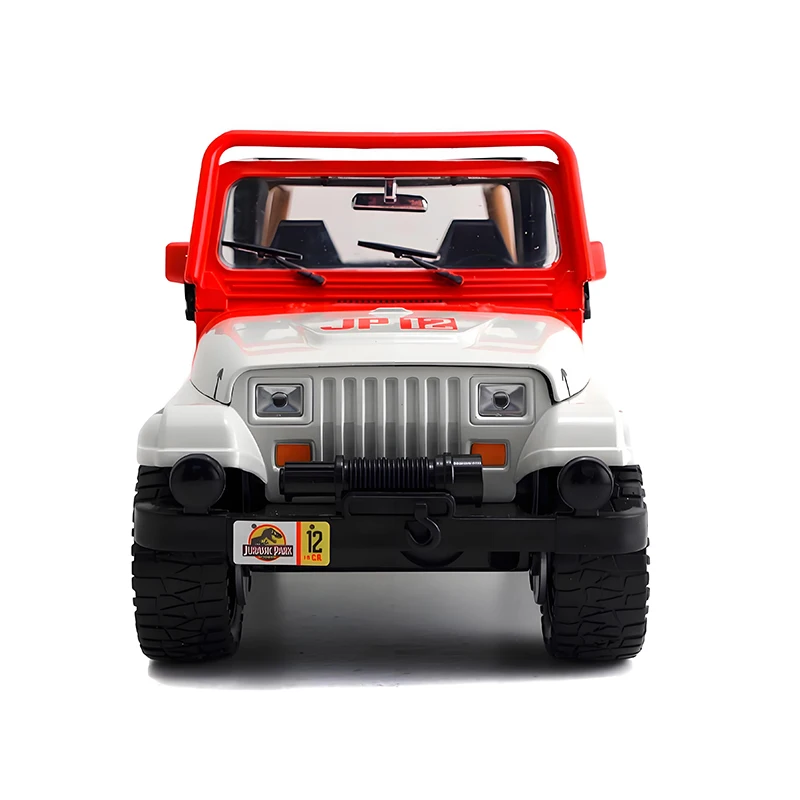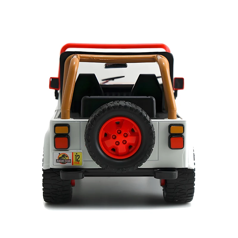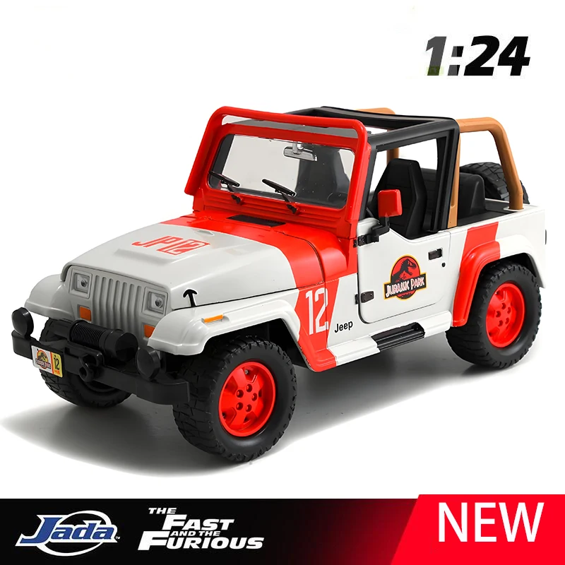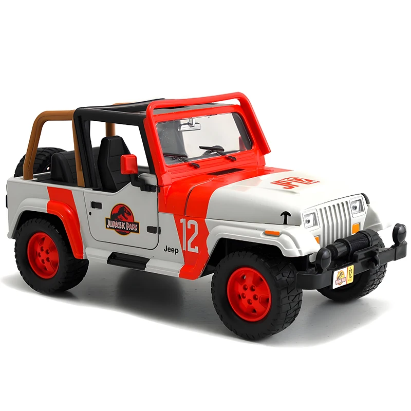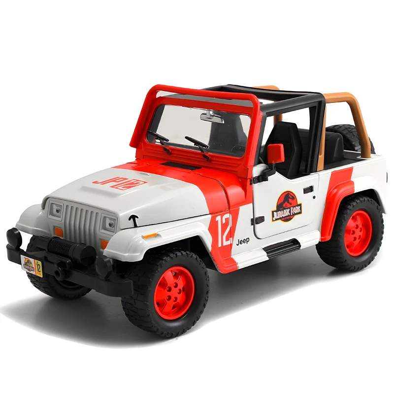 This Jeep Wrangler SUV diecast model captures the adventurous spirit of the Jurassic Park franchise, featuring a 1:24 scale design. The model boasts a stunning white body accented with bold red graphics and a striking black and red Jurassic Park logo on the door, perfectly embodying an outdoor aesthetic. With rugged off-road tires and vibrant red wheels, the vehicle is ready for any adventure. Its open-top style and tan roll bar add to its charm, while the sleek black interior completes the sporty look. Made from a high-quality alloy and plastic blend, this non-electric replica requires no batteries, making it perfect for avid collectors aged 14 and older.