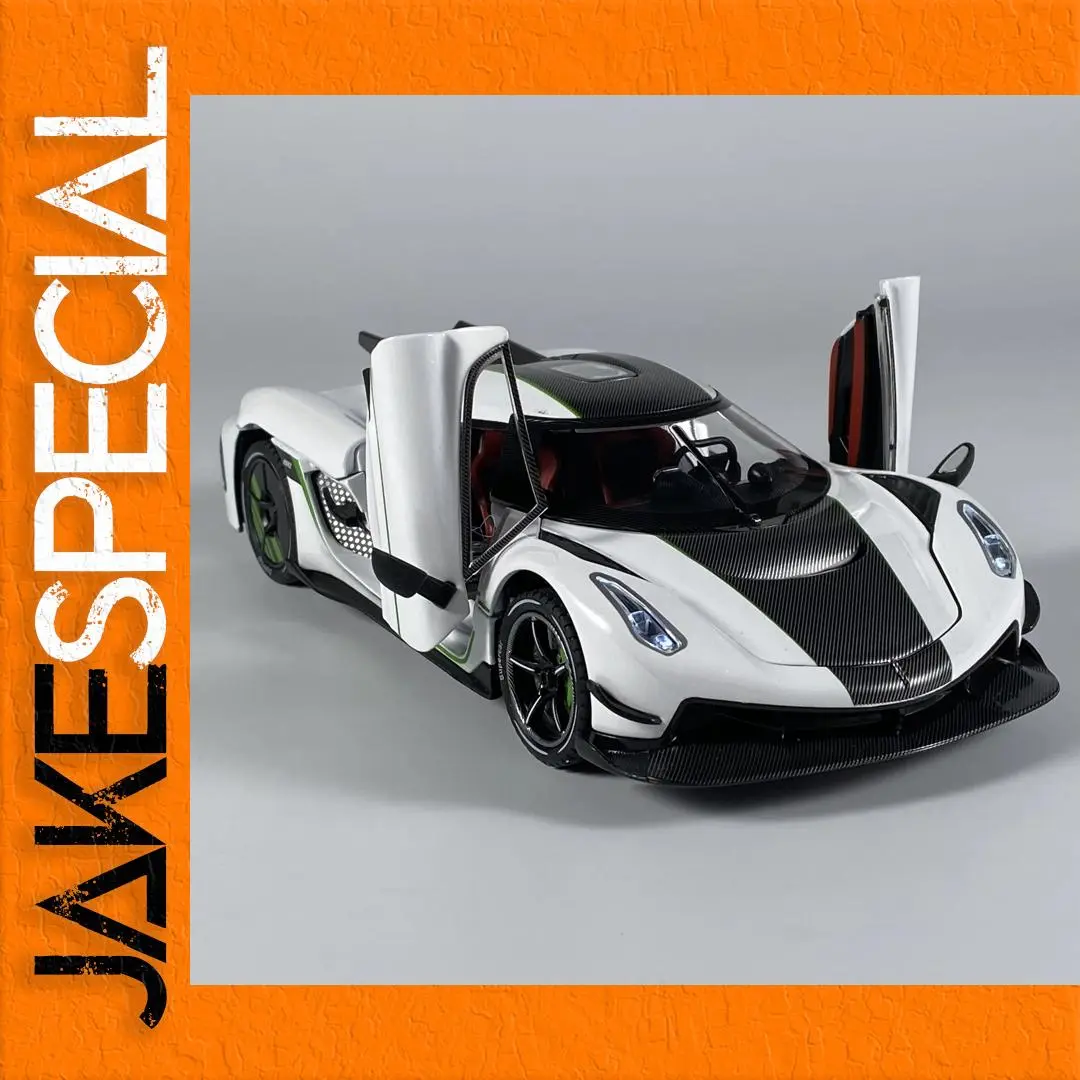 This Jesko Absolut 1:24 diecast supercar model captures the thrill of high-performance automotive design with a sleek, aerodynamic silhouette featuring sharp lines and smooth curves. Made from durable metal alloy, it measures approximately XX centimeters in length and boasts realistic details such as a front splitter, intricate wheels, slim black side mirrors with supports, and LED-compatible headlamps and taillights. The model includes sound effects mimicking engine noise and a pull-back mechanism for smooth movement. Available in white, black, and red options, it features striking carbon fiber-like accents on the roof, body, hood stripe, and door trim, making it a stunning display piece for enthusiasts and collectors.