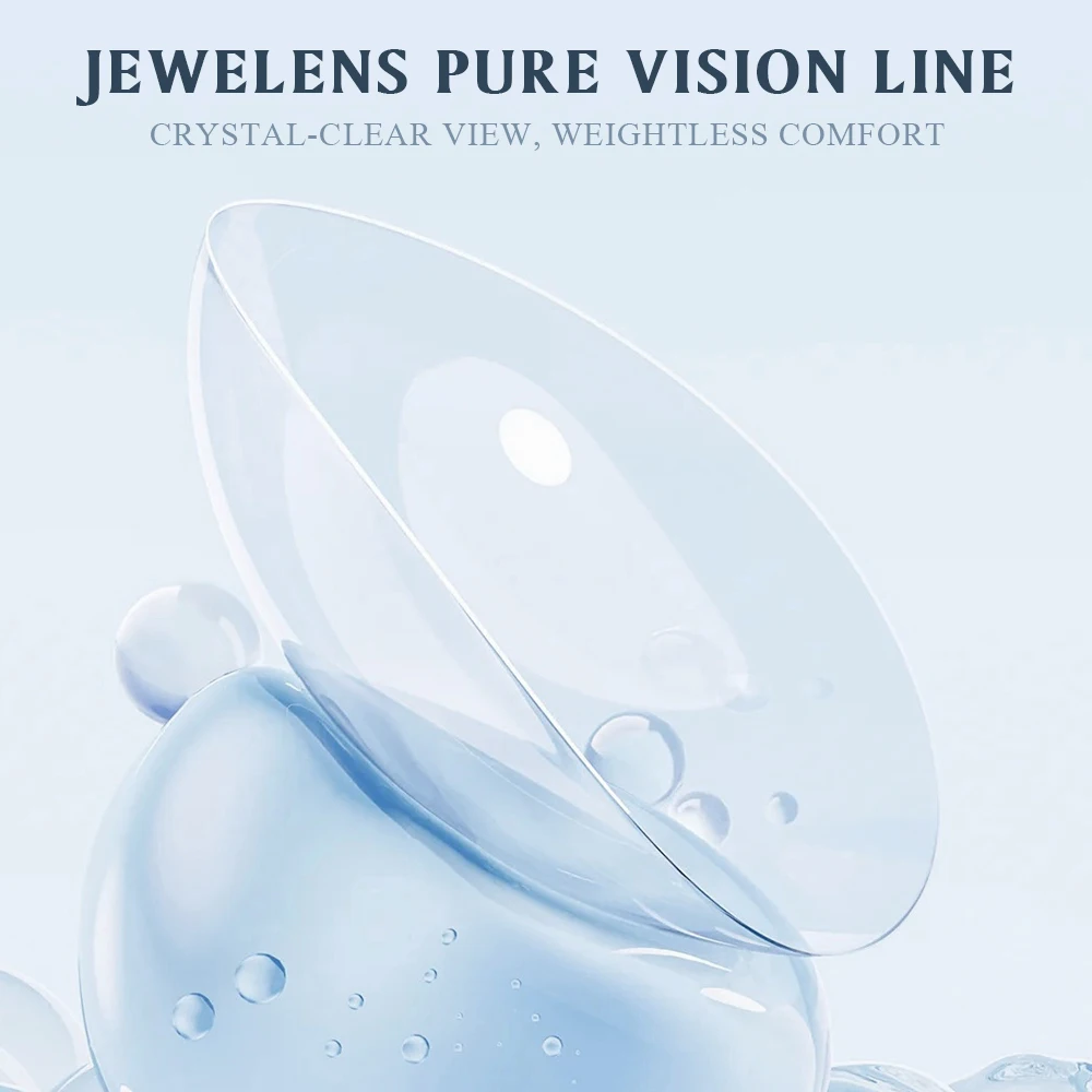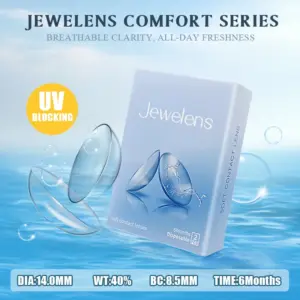 Experience the natural clarity and breathability of this this JEWELENS Comfort Series contact lenses, designed to deliver effortless comfort and a seamless fit for everyday wear. Crafted from high-quality HEMA material with a 40% water content, these lenses ensure your eyes stay hydrated and vibrant all day long. The sleek, minimalist packaging features soft light blue and white tones that evoke freshness and purity. Floating around the lenses are realistic, transparent, semi-oval shapes with water droplet effects, emphasizing their moisture content and breathability. A bright yellow “UV BLOCKING” badge assures protection from harmful rays, while the bold dark gray text highlights the product name and benefits. Discover a comfortable, natural look that makes every day bright and clear.