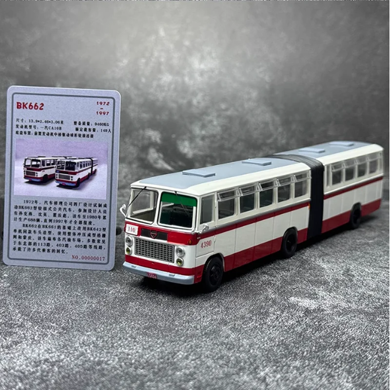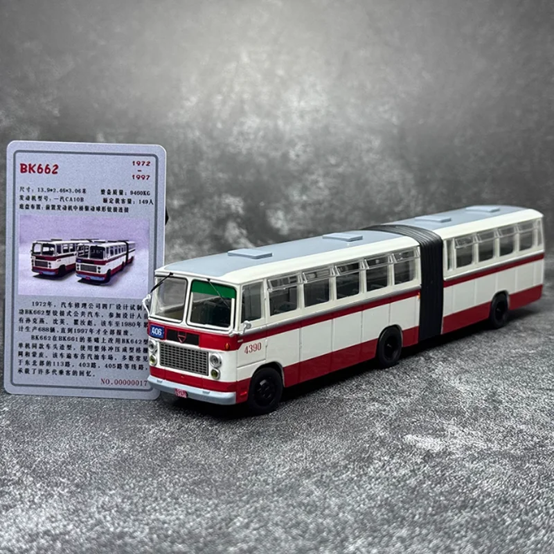 Imagine adding a touch of realism and elegance to your collection with this intricately crafted Jinghua BK662 articulated bus model. Measuring approximately 22 centimeters long, 4.5 centimeters wide, and 5 centimeters high, this model features a sleek, metallic alloy construction that boasts a luminous sheen. The pristine white base color is accented by a bold red stripe around the lower section, just above the wheels, enhancing its vintage-inspired design. Realistic rectangular windows run along the sides, while the detailed front includes a large windshield, side mirrors, headlights, and a grille. The black accordion joint in the middle beautifully simulates the genuine articulated feature of the original vehicle. It's perfect for display, decoration, or as a meaningful gift for enthusiasts who appreciate craftsmanship and detail.