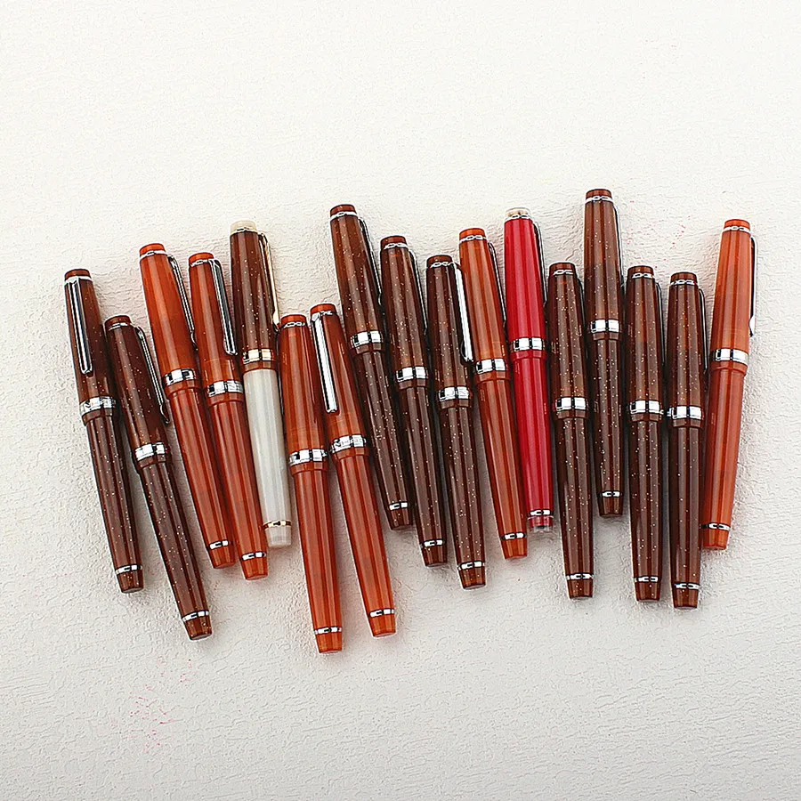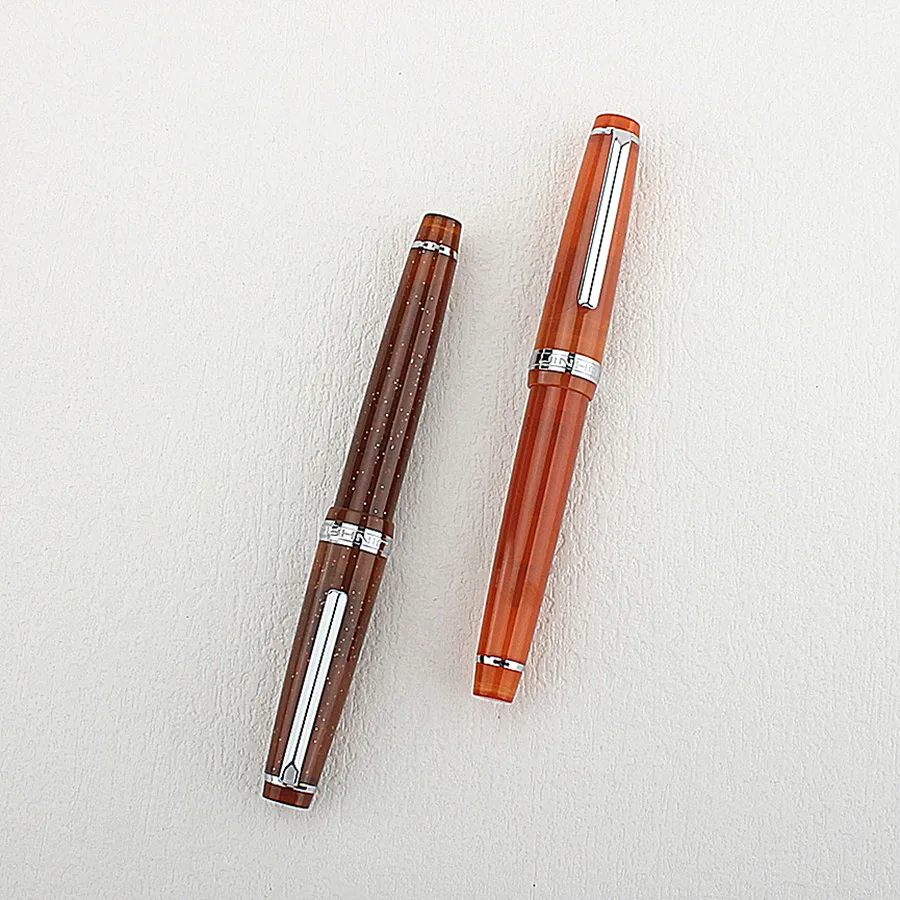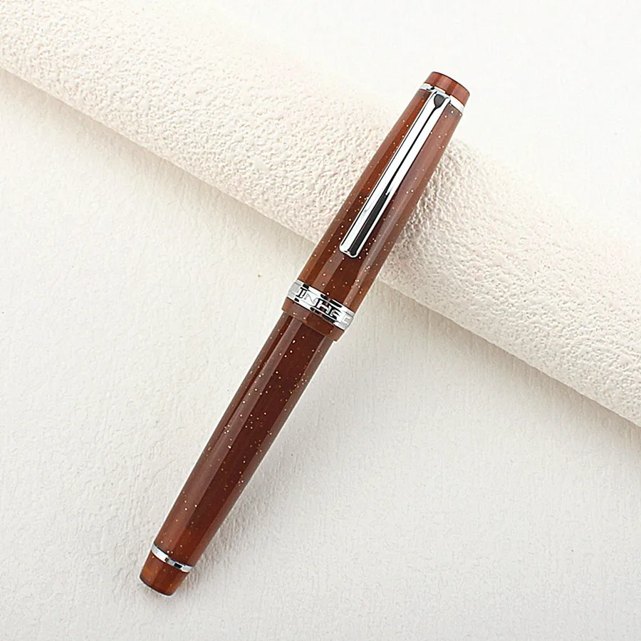 Experience the sophistication of this high-quality Jinhao 82 fountain pen, crafted for those who appreciate fine writing instruments. Its beautiful acrylic body in warm brown features a delicate pattern of white and gold speckles, offering an eye-catching yet refined aesthetic. The cylindrical shape with smoothly rounded ends enhances its modern appeal. The cap perfectly matches the body, topped with a polished silver band and metallic clip for ease of use. Beneath the cap, the intricately designed stainless steel nib adds a touch of elegance and precision, available in EF (0.38mm), F (0.5mm), or M (0.7mm) sizes. Perfect for daily writing or special notes, this pen combines style and functionality in a luxurious package, elevating your writing experience.