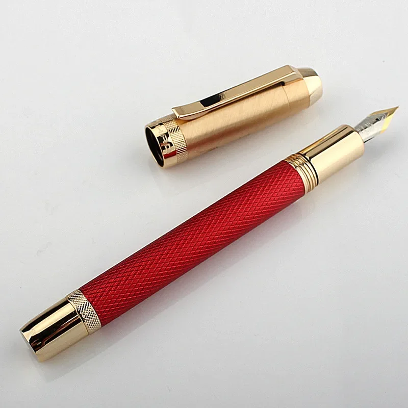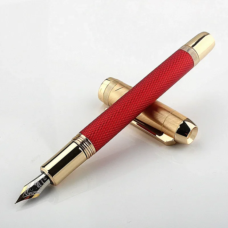 Experience the sophistication of this luxury JINHAO 92 Metal Fountain Pen, crafted for writers who appreciate style and precision. Its vibrant textured red body, enhanced with diamond-pattern grip, offers both a comfortable hold and a striking appearance. Accented with polished gold-colored metal at the ends and cap, it exudes an air of class and professionalism. The fine stainless steel nib, available in EF (0.38mm), F (0.5mm), and M (0.7mm), ensures smooth, precise lines suitable for all writing styles. Whether for business, school, or personal use, this pen elevates your writing experience with its blend of unmatched elegance and technical excellence. It’s a perfect choice for those seeking a refined writing instrument that makes a statement.