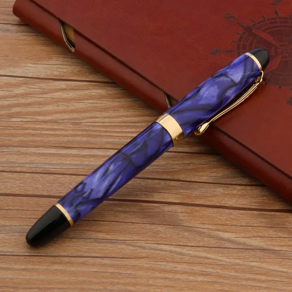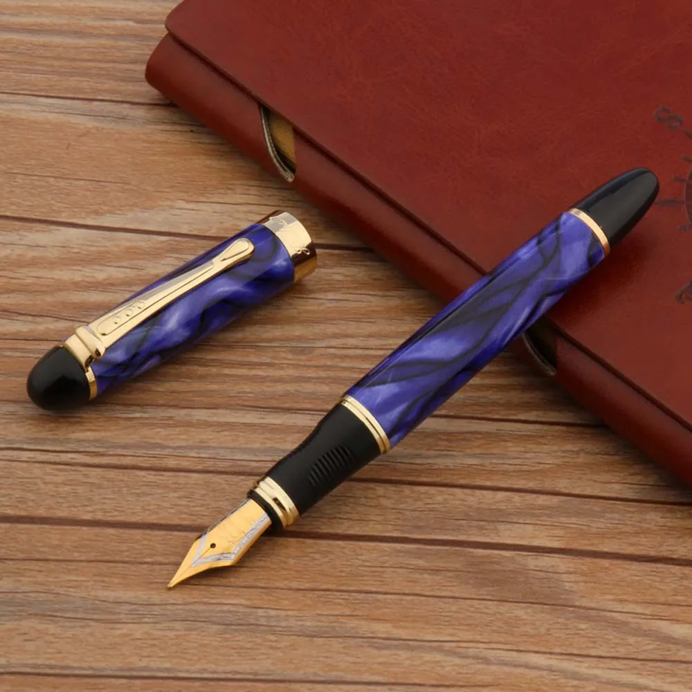 Experience the sophistication of this luxurious purple fountain pen from Jinhao X450, designed for professionals and enthusiasts who appreciate premium writing instruments. Its vibrant, marbled purple barrel boasts darker and lighter shades, creating depth and visual richness. Made from high-quality resin or lacquered finish, the glossy surface exudes elegance and durability. The sleek metal body features subtle gold accents on the clip and around the nib area, adding a touch of class. The matching cap with rounded edges and sturdy clip completes the refined look. Behind the nib, a textured black grip ensures comfortable handling during extended writing sessions. Enrich your office or study with this premium, customizable fountain pen that combines style, function, and craftsmanship effortlessly.