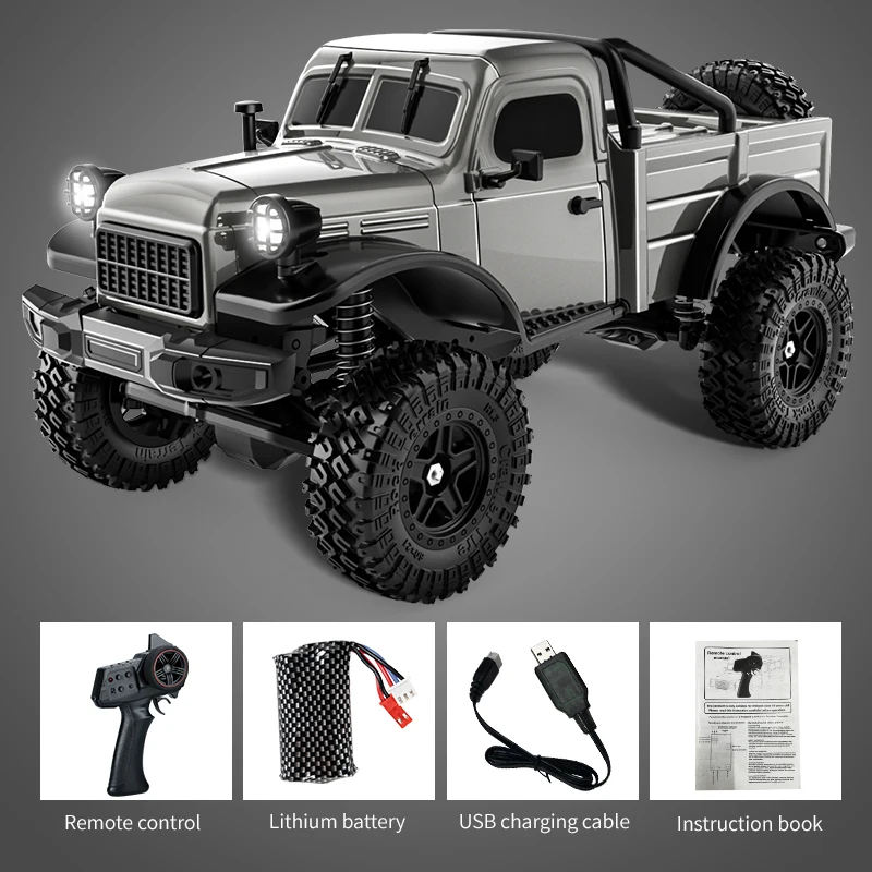 Experience thrilling off-road adventures with this rugged 4WD RC pickup truck, featuring a detailed, modern design in colors like blue, green, grey, and red. Equipped with a powerful brush motor and a sturdy plastic body, it offers excellent climbing capability and durability. The model is controlled via a 2.4GHz remote with a communication range of about 100 meters and 4 control channels, providing responsive handling. It is ready to run, with a 7.4V 500mAh controller battery delivering around 40 minutes of driving time per charge. Designed for ages 14 and above, this off-road RC truck combines technical excellence with a realistic, adventurous aesthetic for adult collectors and enthusiasts.