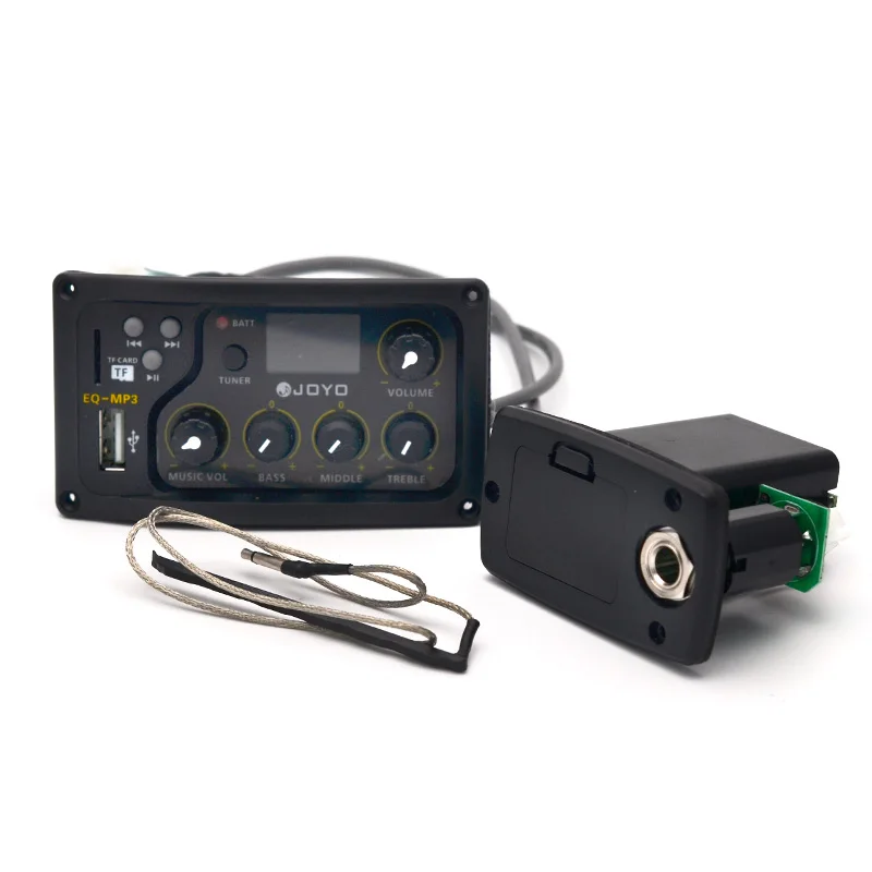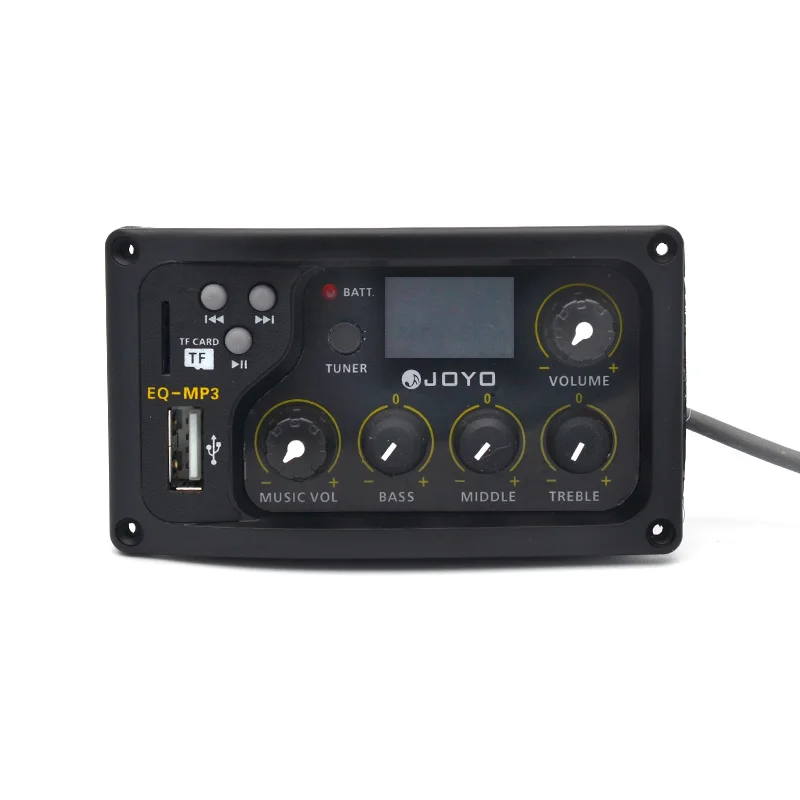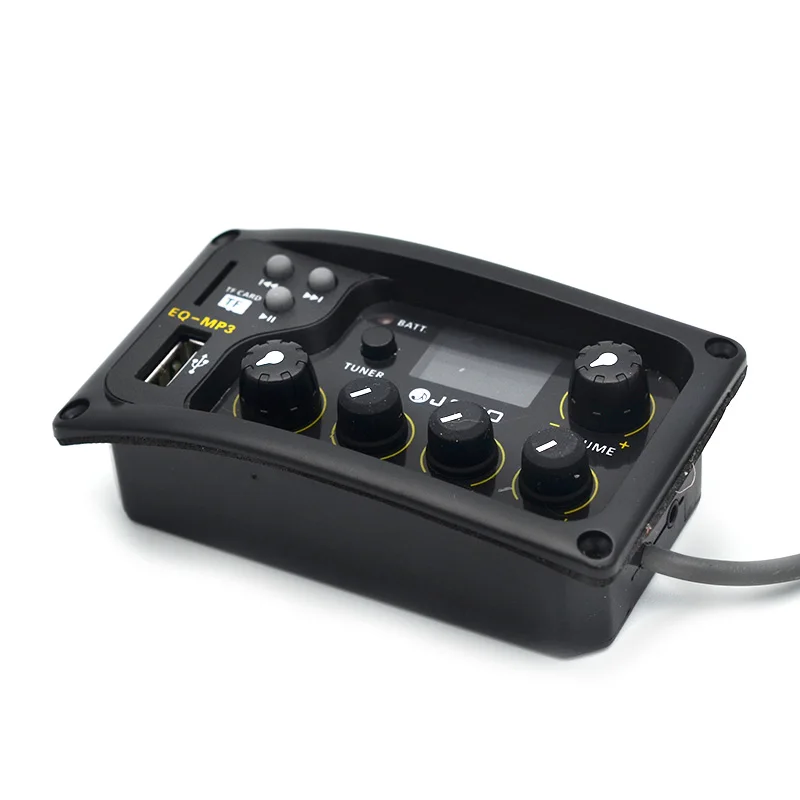 Imagine achieving perfect tonal balance for your acoustic guitar effortlessly. This sleek, black, rectangular equalizer combines sophisticated design with powerful features. The semi-transparent organic glass front panel adds a modern touch, revealing internal components while maintaining a minimalist aesthetic. The device offers precise control over bass, middle, and treble frequencies, each adjustable by up to ±12dB. It also includes a volume knob highlighted by a yellow accent for quick visual reference. Supporting MP3 playback through SD card or U-Disk input, you can easily customize your sound and playback. Its compact size makes it an excellent addition to your guitar setup, delivering professional sound quality seamlessly integrated into your performance or practice routine.