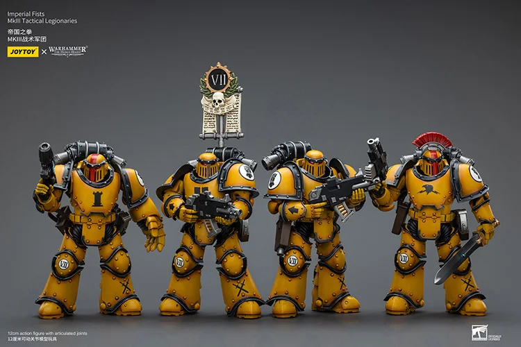 Immerse yourself in the captivating world of Warhammer 40K with the JOYTOY 1/18 Scale Imperial Fists action figures. Crafted with meticulous detail, these figures showcase vibrant yellow armor combined with striking black accents, reflecting the iconic Imperial Fists chapter. Each figure is constructed from durable PVC and ABS materials, ensuring lasting quality for your collection. The unique designs feature dynamic poses and accessories, such as weapons and a decorative stone tablet, embodying readiness and valor. Perfect for any enthusiast, these figures are finished goods, ready to elevate your display. Experience the craftsmanship and artistry each time they catch your eye.