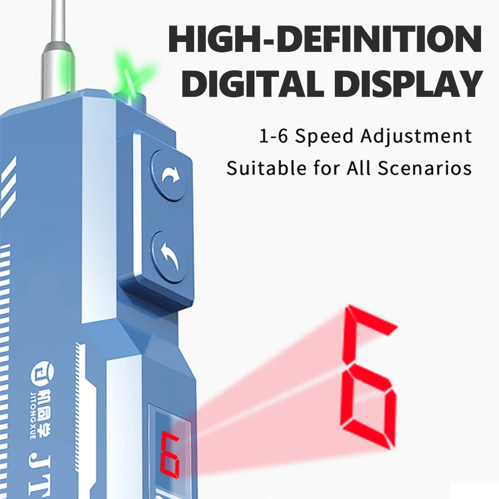 Imagine effortlessly removing stubborn adhesives with this compact, ergonomic tool that fits perfectly in your hand. The JTX G-2 Electric Adhesive Remover features a modern cylindrical design with smooth contours and a refined matte finish, offering both style and comfort. Its integrated precision needle allows for detailed adhesive removal, while the digital display and side buttons give you control over adjustable speed settings (1 to 6). The bright green high-density LED light illuminates dust and residues, ensuring high accuracy during repairs. The dust-showing light function helps maintain a clean workspace, making your repair process smoother and more efficient. This lightweight device is designed for durability and ease of use, perfect for professional technicians or DIY enthusiasts to achieve flawless results.