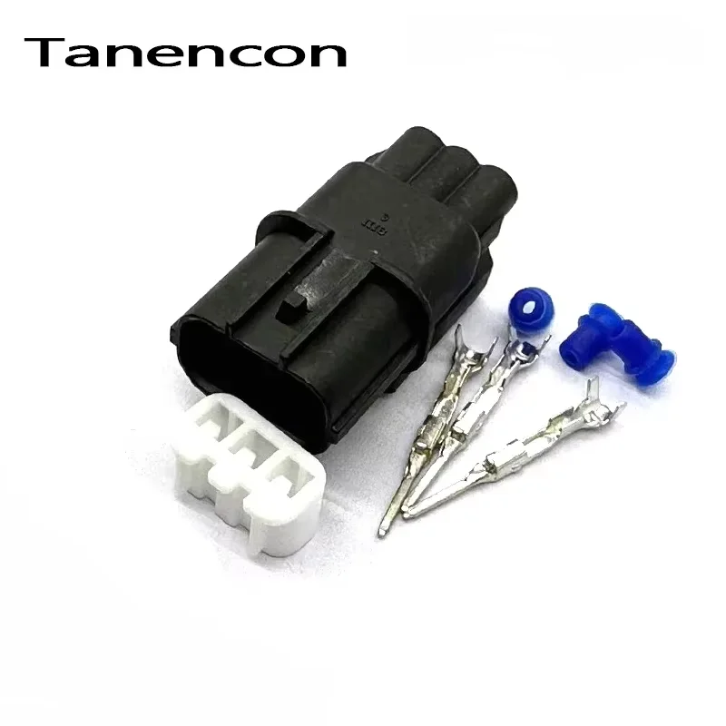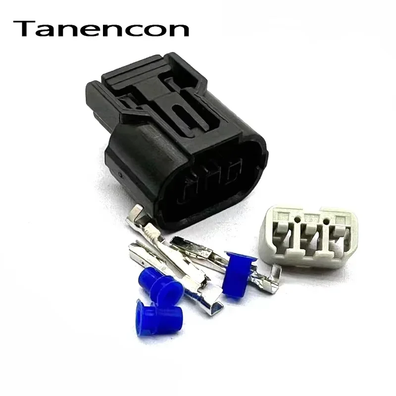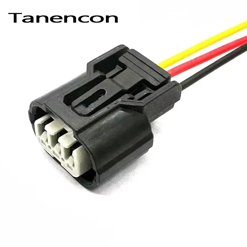 This high-voltage 3 Pin Car Small Lamp Connector by JYCLC is designed especially for ignition coils in Honda vehicles. Featuring a robust black exterior, the connector ensures tough performance in automotive applications. Its left-side rectangular plug has a wide body and rounded edges for a secure grip, complemented by color-coded wires – red, yellow, and black – that add vibrancy. The right connector is more compact, showcasing four visible pins with a transparent section, providing a peek at its secure internal components. Whether you're replacing worn connectors or upgrading your ignition system, this product ensures reliability and durability for your vehicle.
