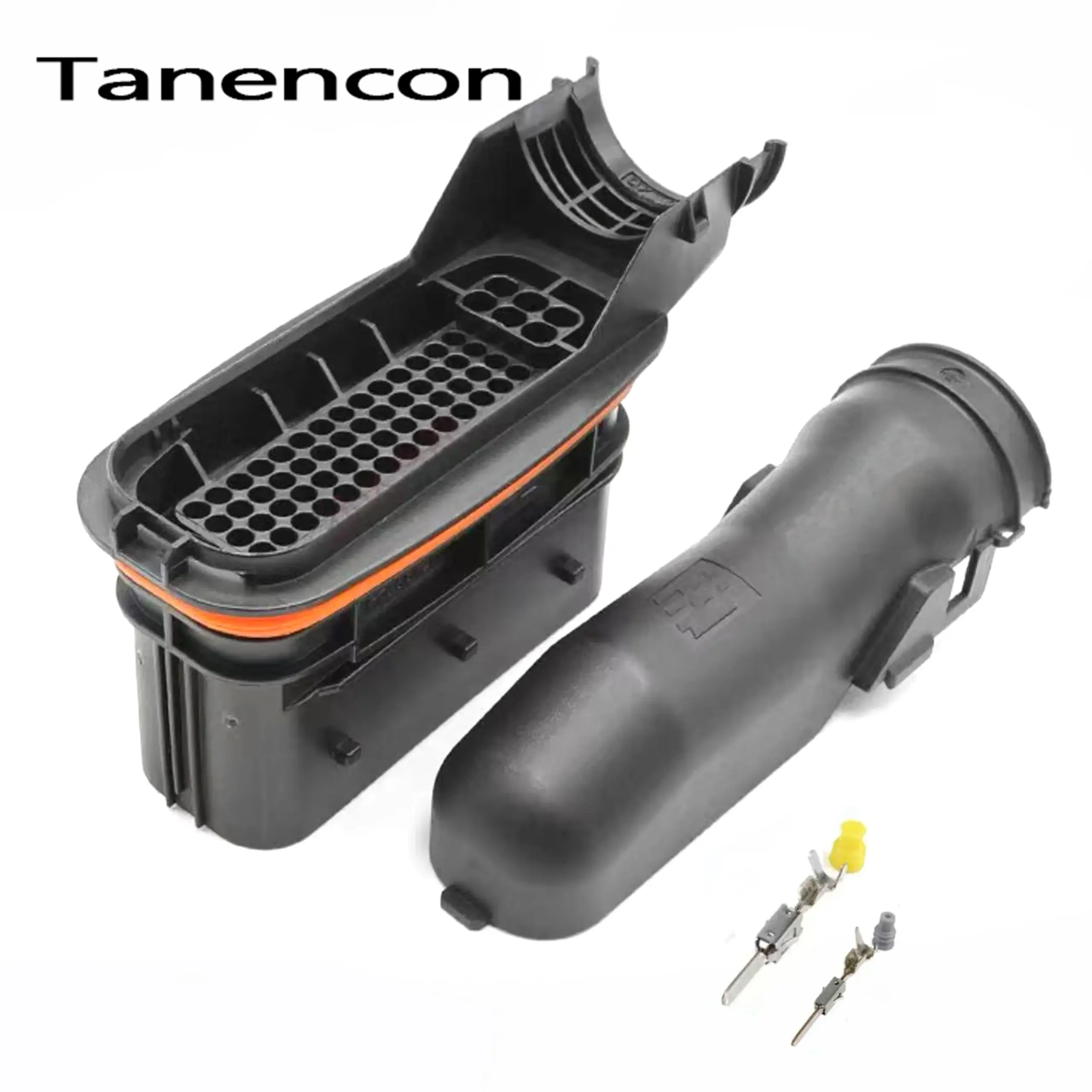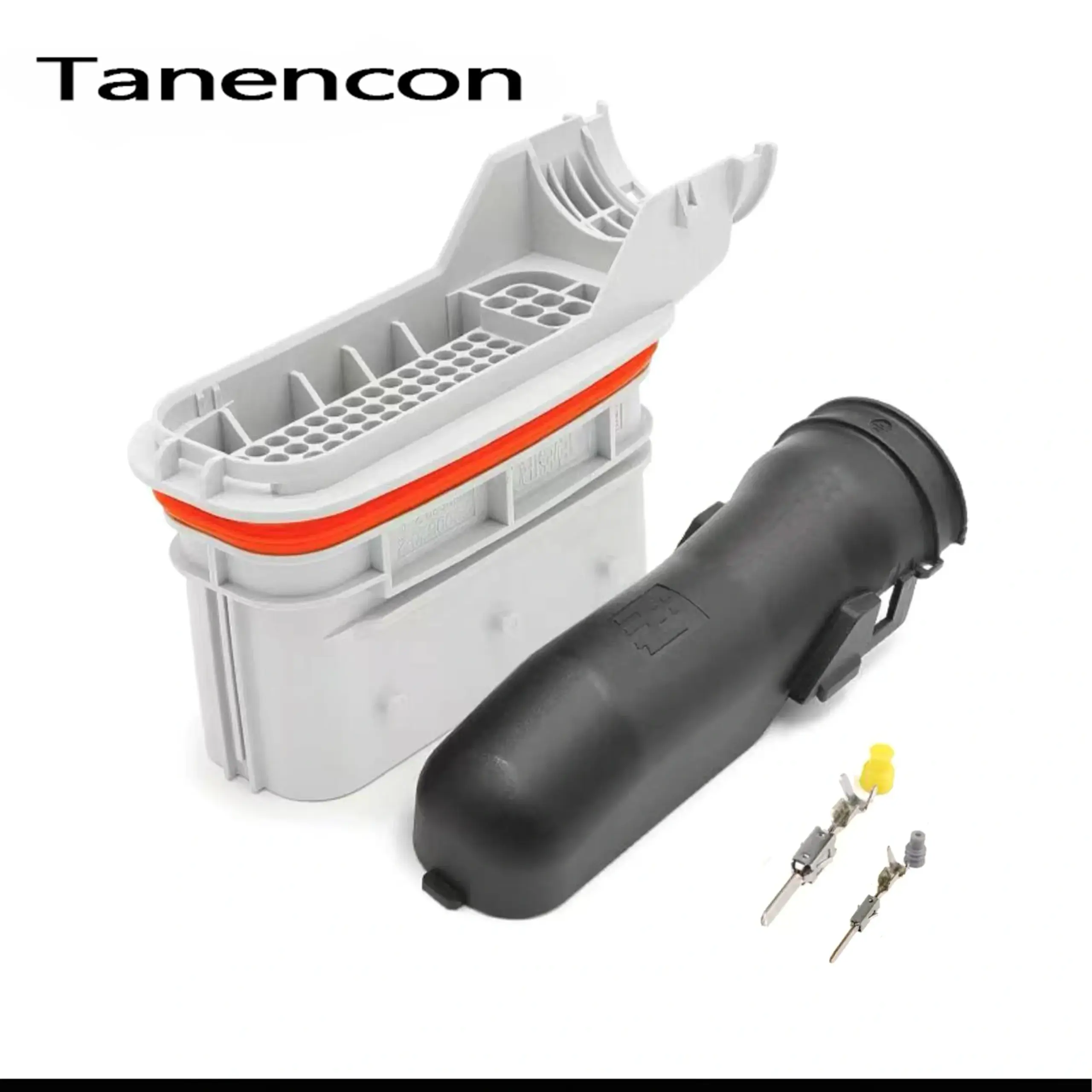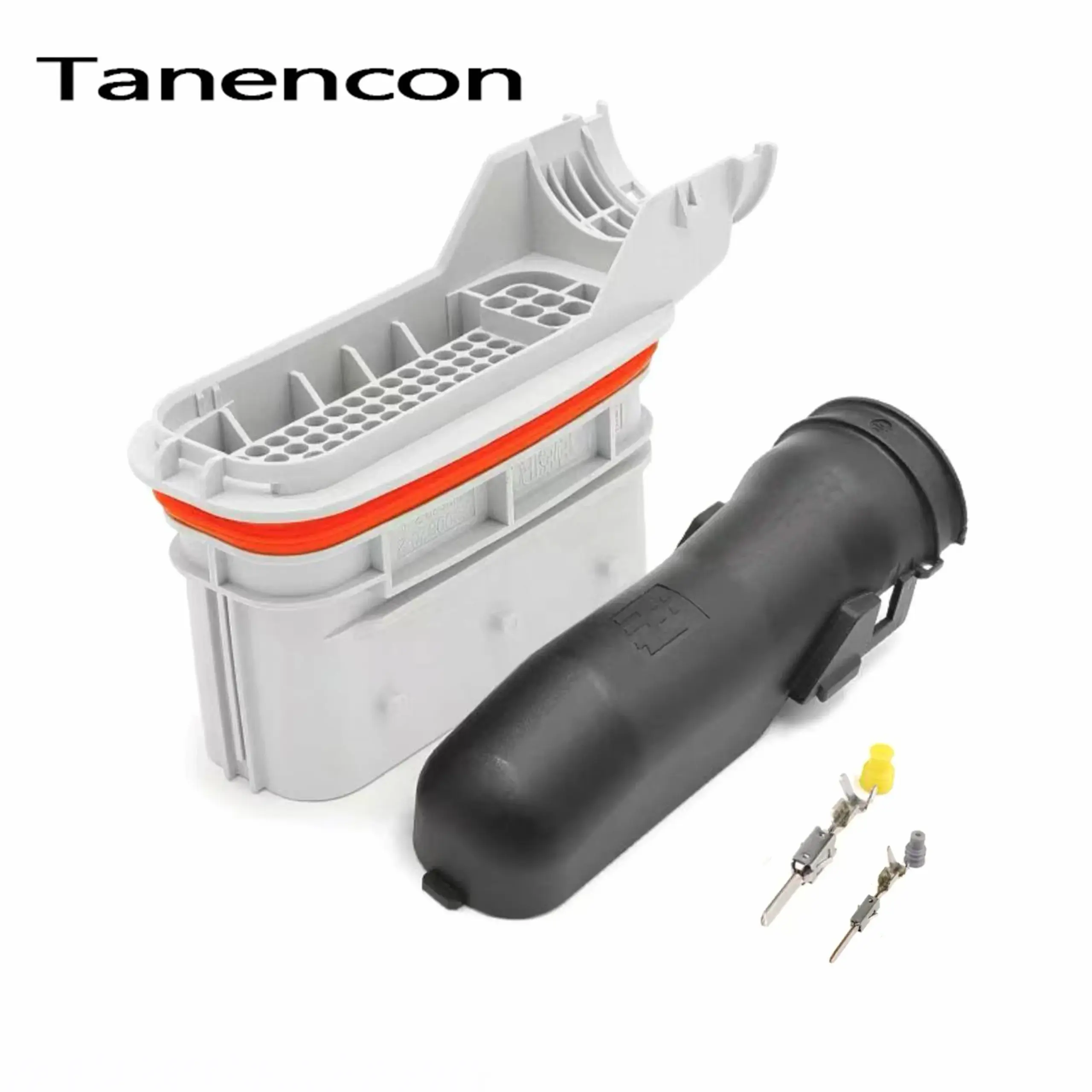 The JYCLC 62 Pin ECU DCU Urine Pump Cable Connector is an essential component for your automotive needs. Engineered for durability and functionality, this connector features a matte black rectangular housing with a distinctive yellow locking mechanism that ensures secure connections. The connector plug is designed for a smooth fit, tapering toward a narrower end, allowing easy and efficient insertion into your vehicle's computer board. The added terminals and waterproof skin plugs offer enhanced protection, making it perfect for use in trucks. Upgrade your vehicle's electronic reliability with this high-quality connector, ensuring years of dependable performance.