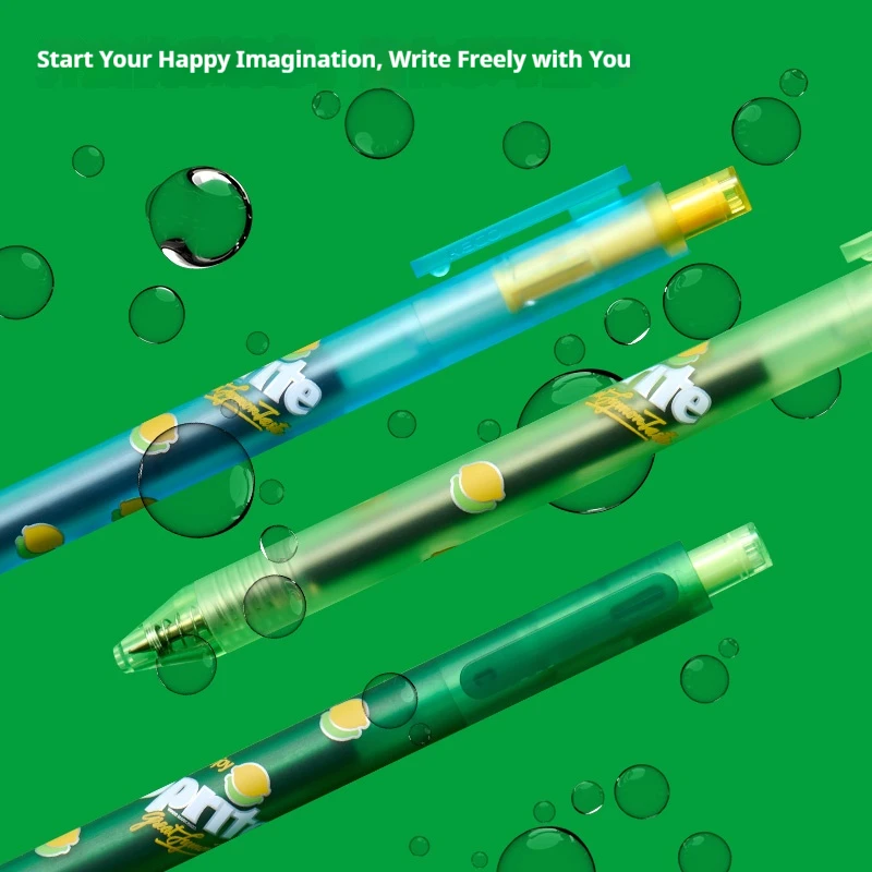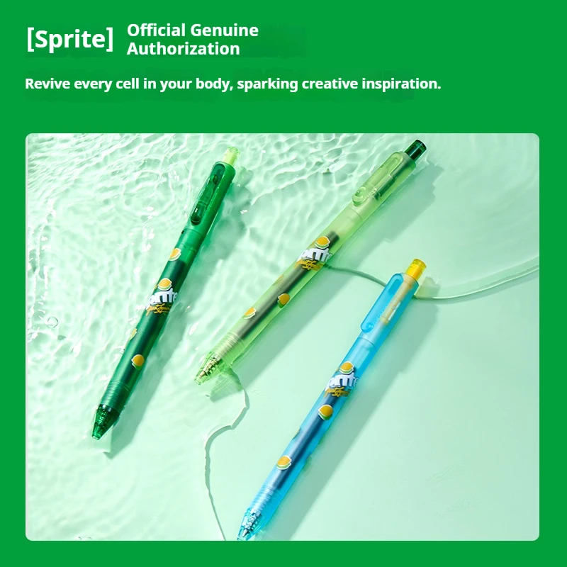 Experience the vibrant and sleek design of this KACO x Sprite co-branded gel pen set, crafted to bring freshness and style to your writing. The trio of pens features transparent or colorful plastic barrels, showcasing the black ink inside, with smooth, cylindrical bodies finished with a soft spray paint offering a matte, comfortable grip. Bright, lively shades of dark green, grass green, and light blue reinforce a cool theme, perfect for creative projects, note-taking, or signing documents. The push-button mechanism makes extension and retraction effortless, while the premium KEFILL double-ball tip technology ensures smooth ink flow and quick drying. Imagine writing with these stylish pens and elevating your stationery collection with their modern, dynamic aesthetic and reliable performance.
