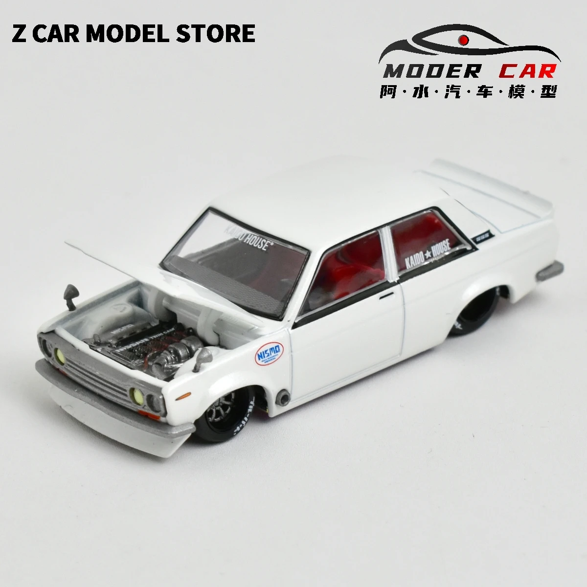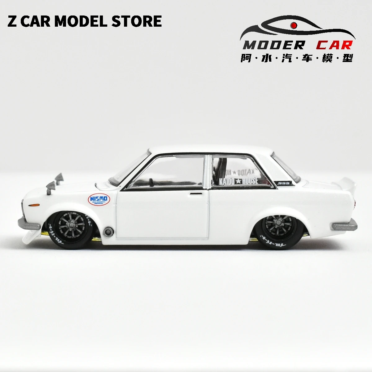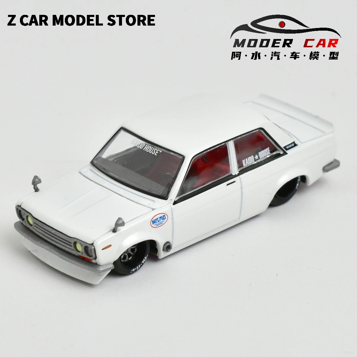This 1:64 scale diecast model car showcases a striking white color with a sleek, vintage-inspired design and rounded edges. Made of metallic construction, it features a glossy white finish complemented by a matte silver rear bumper. The classic appeal is enhanced by rectangular red tail lights and an intricate license plate area marked “NISMO.” Performance-oriented low-profile tires contribute to its sporty aesthetic, while clear windows reveal a red-detailed interior. Perfect for adult collectors, this model embodies the essence of classic automobiles with meticulous attention to detail. Embrace the charm of vintage vehicles today with this captivating collectible.