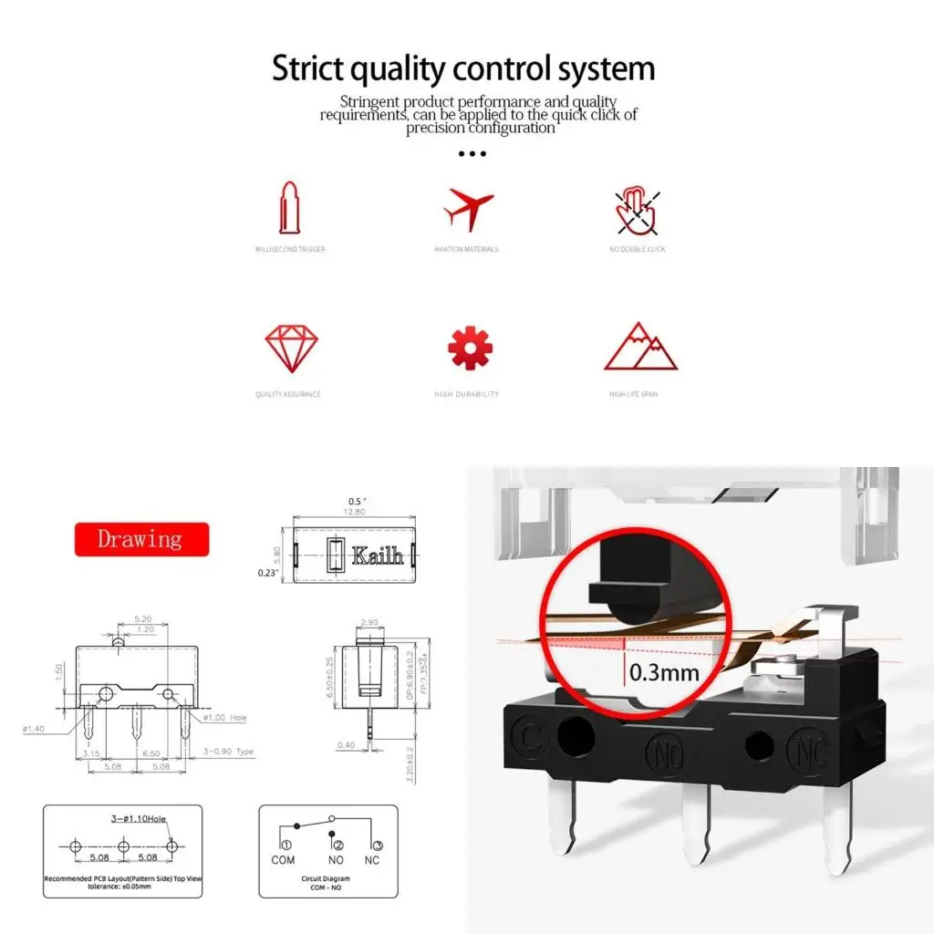 - Technical specifications include: gold contactors to ensure high conductivity, a gridlike contact system for durability, plastic body, size optimized for simple integration into mouse circuits, supporting up to 80 million click cycles.