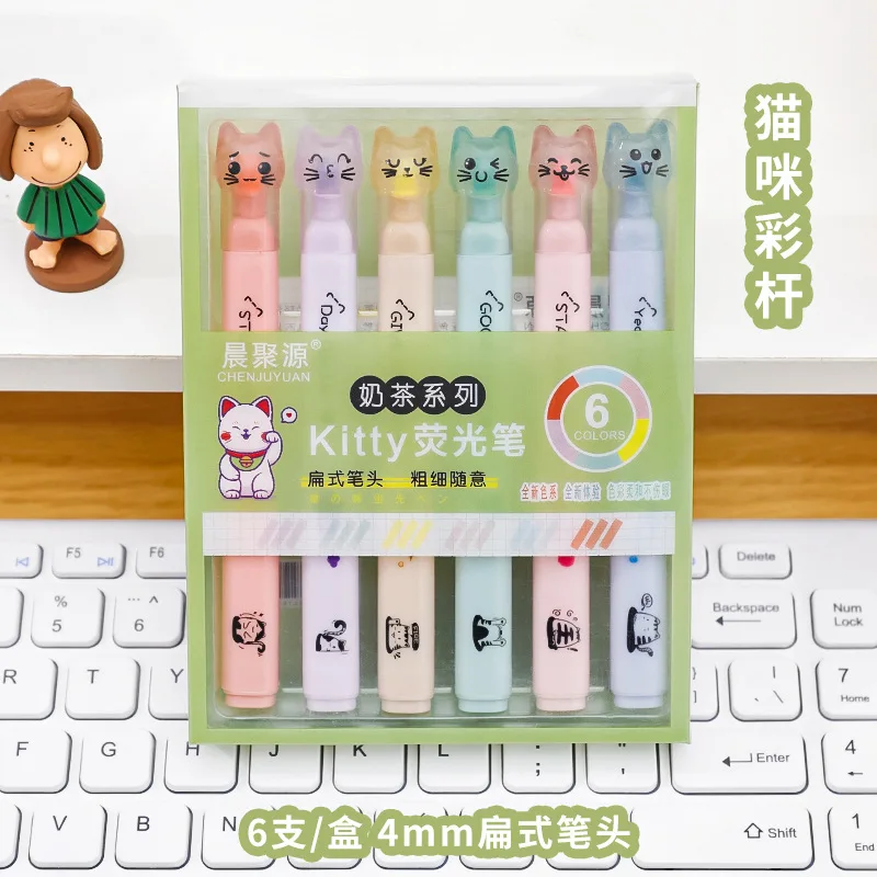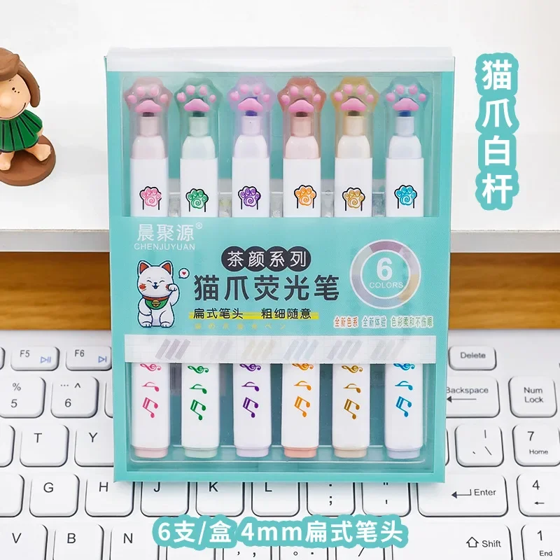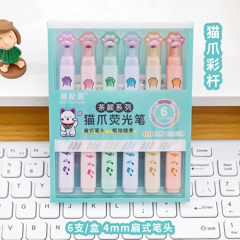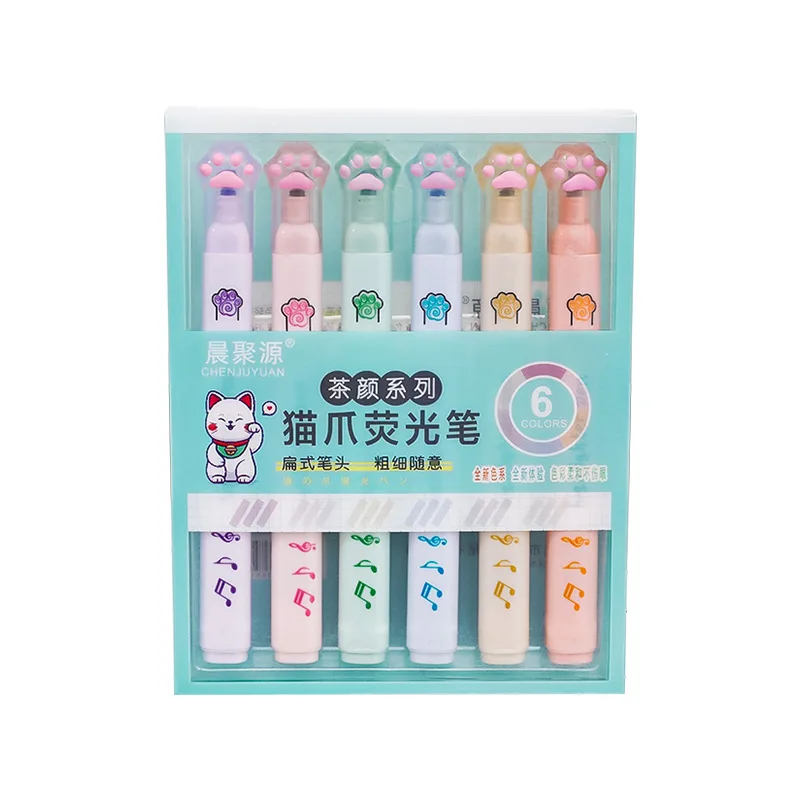 - This set contains six highlighters with playful cat claw and paw motifs, available in four colorful styles—Cat Claw Color Rod, Cat Claw White Rod, Cat Color Rod, and Claw Flat—for variety.