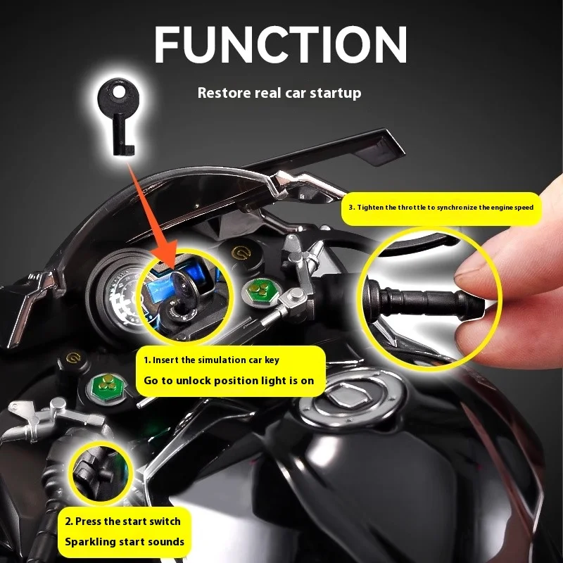 - Features built-in sound and light effects, including compartments near the front and rear lights, creating an engaging display that simulates the motorcycle’s active performance dynamics.