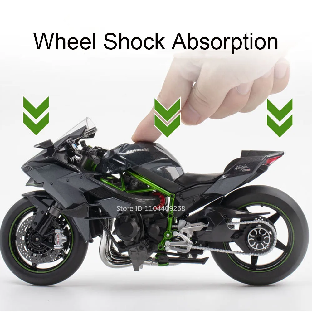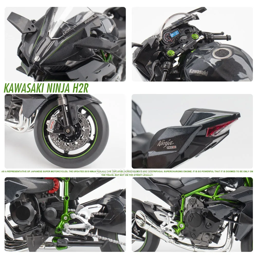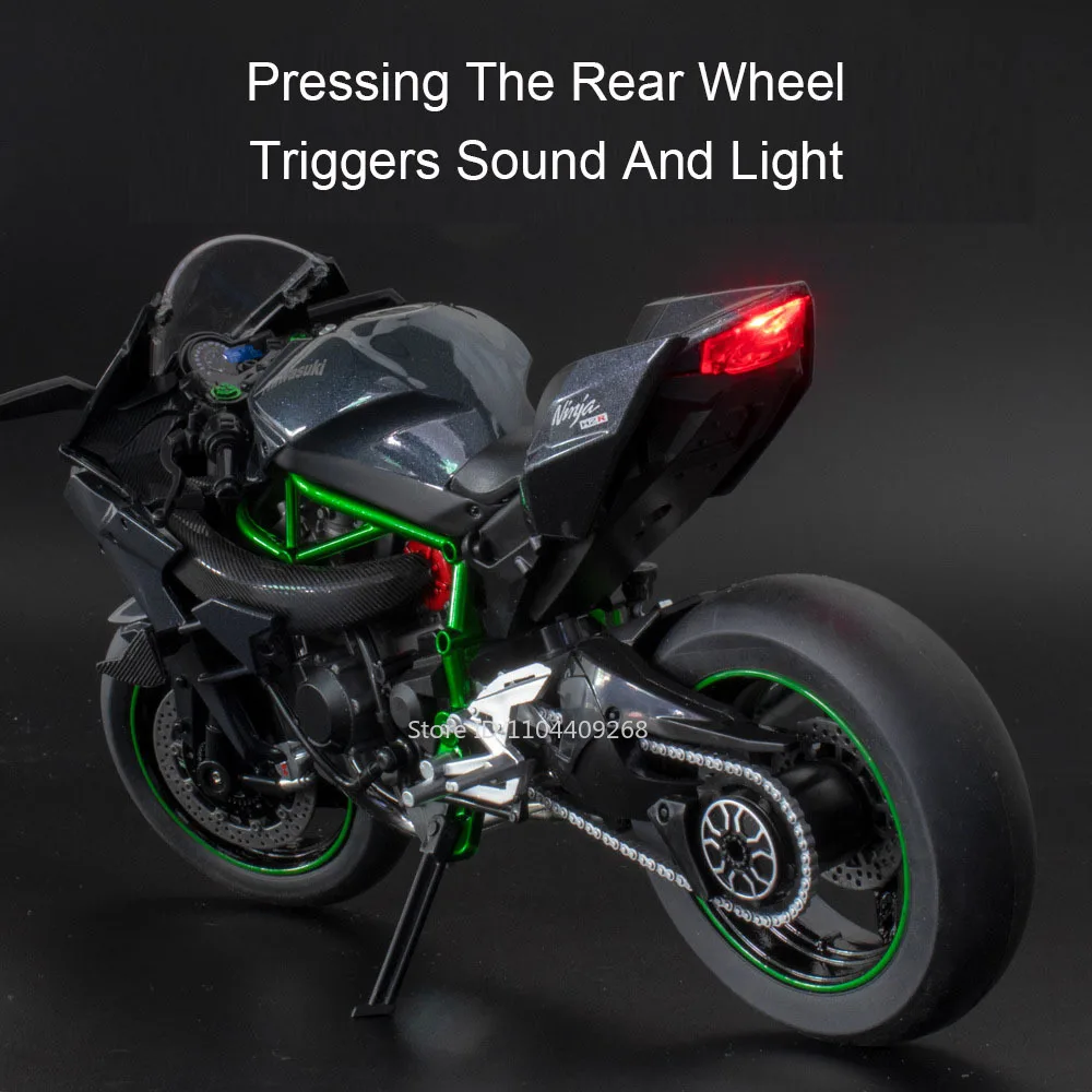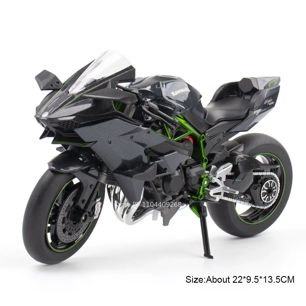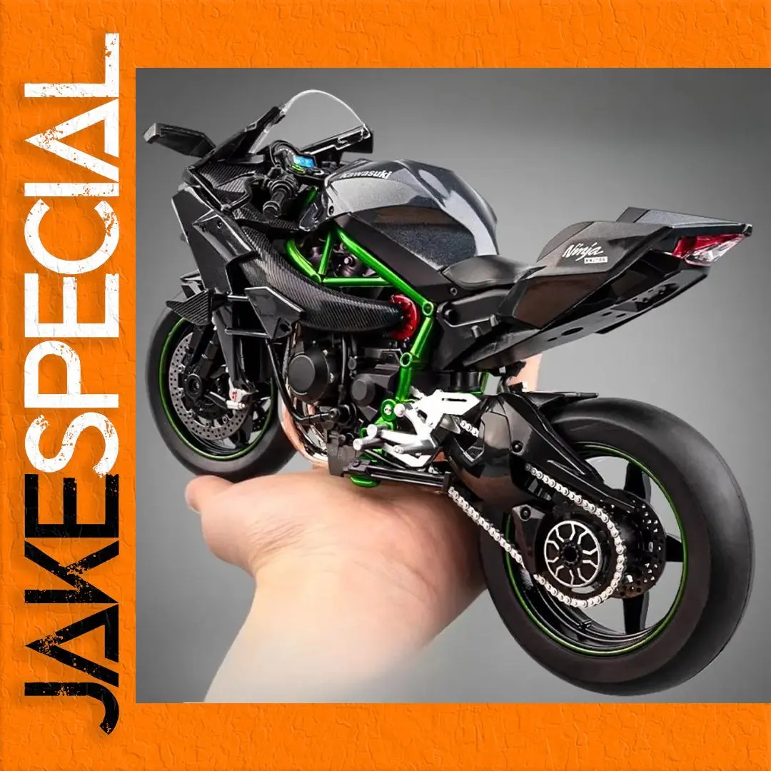 Experience the thrill of owning a highly detailed, collectible motorcycle replica with this realistic 1:9 scale model. Crafted with a diecast metal body, plastic chassis, and rubber tires, it offers durability and authentic appearance. The sleek black Kawasaki H2R version features vibrant green accents that highlight its sporty, high-performance design, while the white R1250 GS exudes a sophisticated, modern appeal. Measuring approximately 22 x 9.5 x 13.5 cm (H2R) and 24 x 11.5 x 15.5 cm (R1250 GS), this model showcases aerodynamic contours, sharp edges, and intricate detailing on the handlebars, suspension, and brake systems. Its functional features – sound, light, front wheel steering, and shock absorption – further enhance its realism. Perfect for collectors or enthusiasts, it makes an impressive display piece that brings racing spirit right into your space.