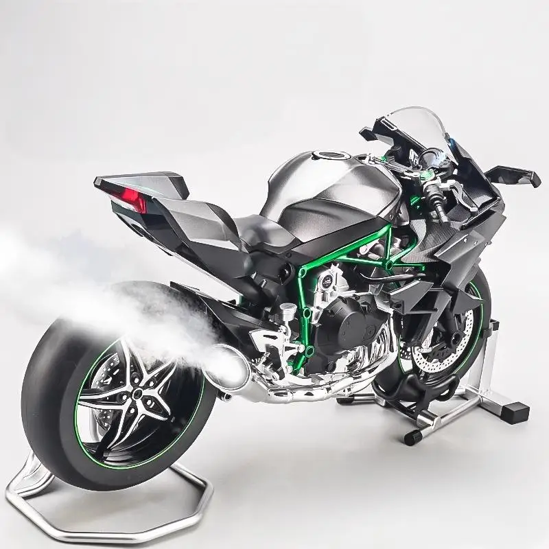 This stunning diecast model of the Kawasaki H2R H2 Racing Motorcycle is a must-have for collectors and enthusiasts. It features a sleek black finish with vibrant green accents that highlight its modern, aerodynamic design. The intricate detailing showcases its multi-spoke wheels, realistic engine, and exhaust components, while functional grips on the handlebars enhance its lifelike appearance. With both light and sound capabilities, this dynamic ornament captures the essence of real racing motorcycles. Perfect for display, this model beautifully represents exceptional craftsmanship and attention to detail.